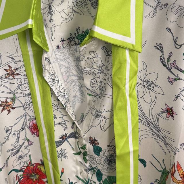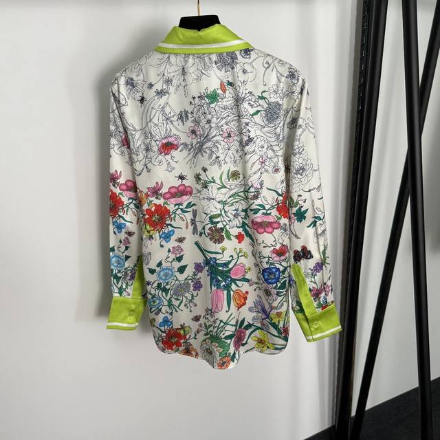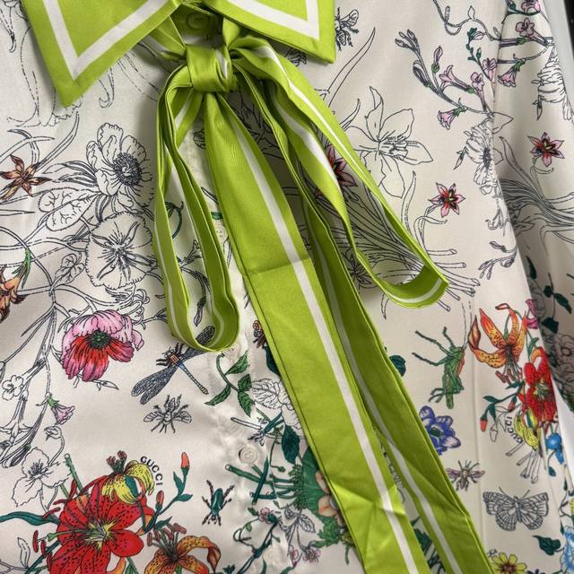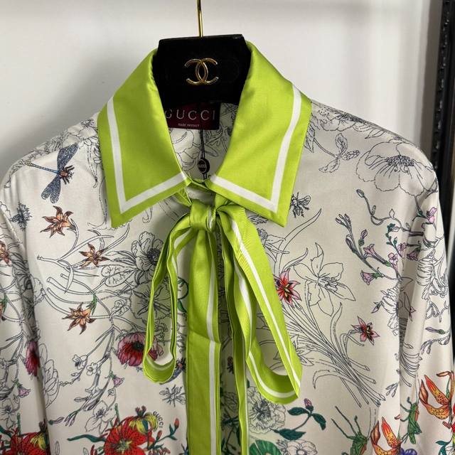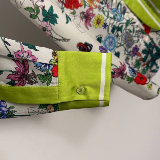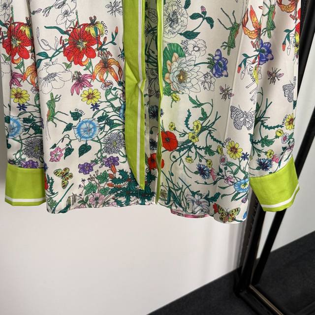 Style No. 20255223 Gucc* new bow tie collar colorful flower print versatile temperament long-sleeved shirt, green, Sml, M size; shoulder width 41, chest 104, sleeve length 58, length 66; weight: 0.200 kg.