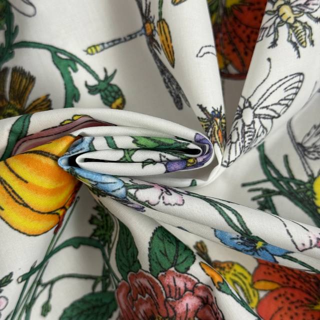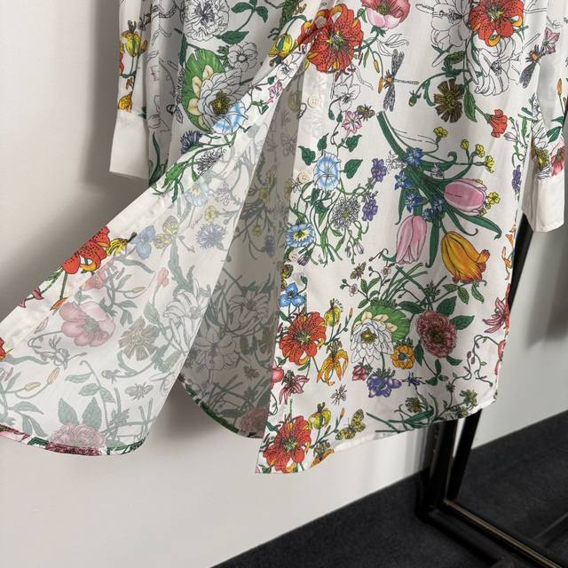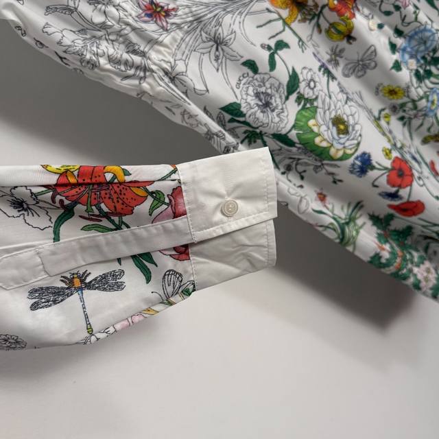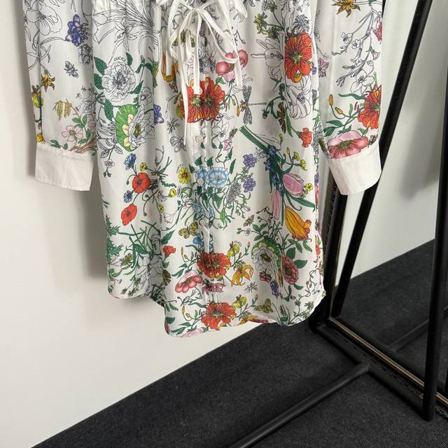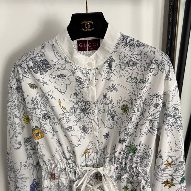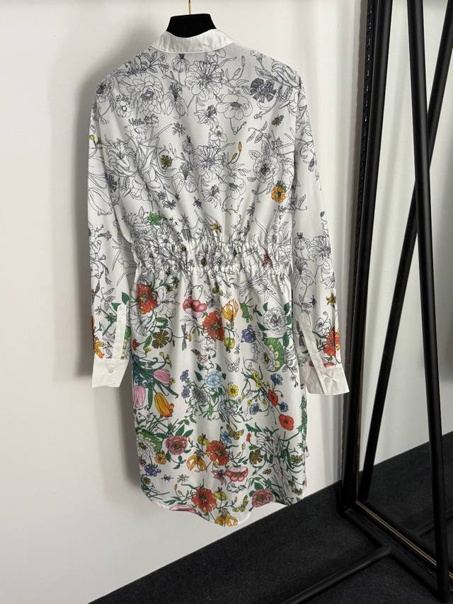 Style No. 20255226 Gucc* New Temperament Colorful Flower Print Tie-Waist Stand Collar Long Sleeve Cotton Dress, White, Size Sml, M; Shoulder Width 51, Chest 110, Sleeve Length 57, Length 104; Weight: 0.255Kg