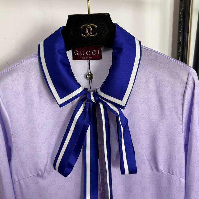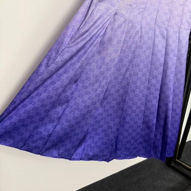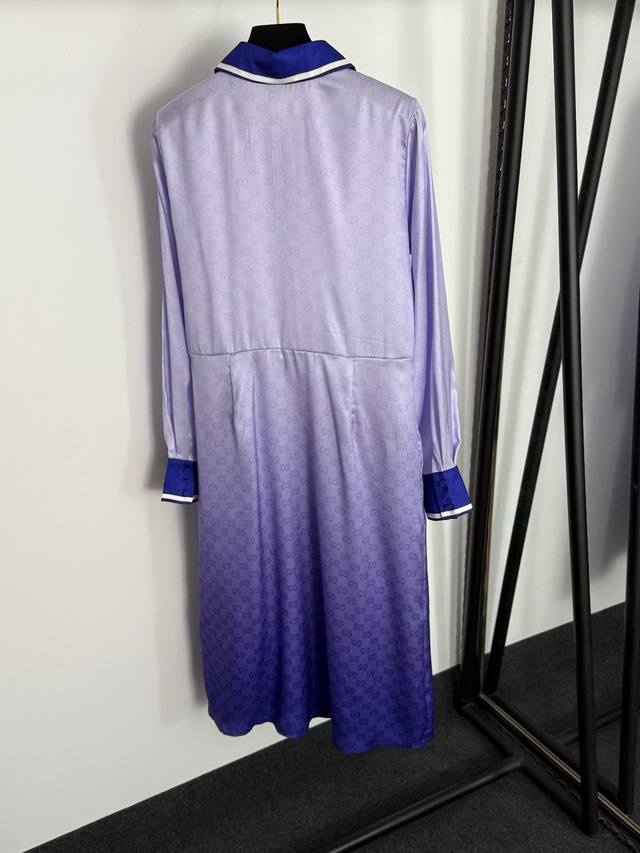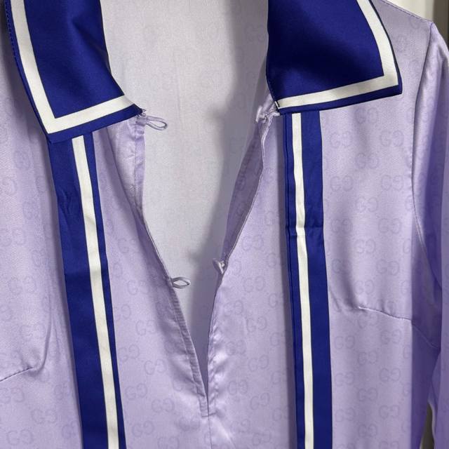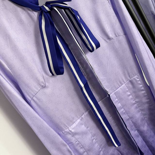 Style No. 20255229 Gucc* New monogram Gg letter print gradient bow tie pleated waist long sleeve dress, light purple, Sml, M size; shoulder width 37, chest 92, waist 80, sleeve length 63, length 113; weight: 0.275Kg