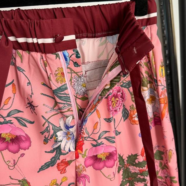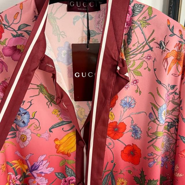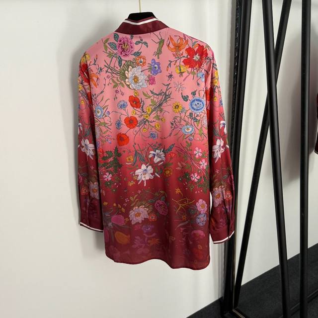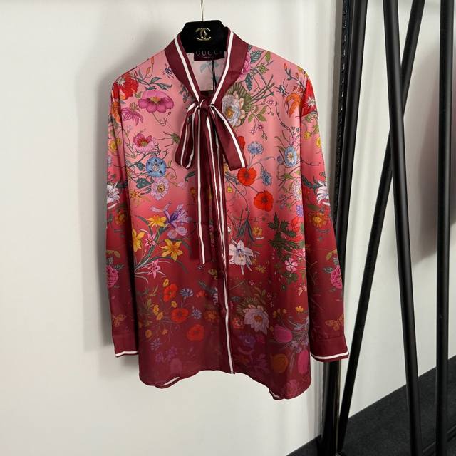 Style No. 20255283 Gucc* newest suit, elegant colorful floral print gradient bow collar long-sleeved shirt + elastic waist wide-leg trousers, red, sizes S-Xl, M; shoulder width 49, chest 112, sleeve length 55, length 74; waist 64 elastic, length 103; weight: 0.420Kg.