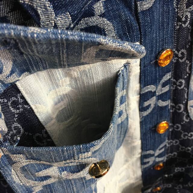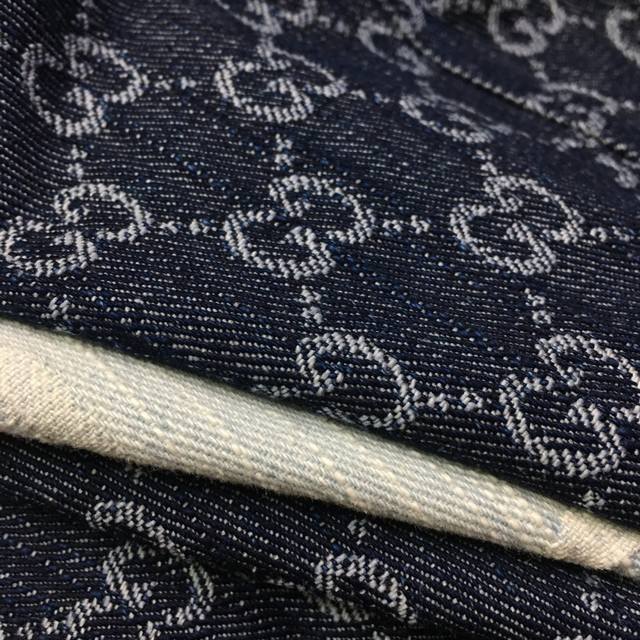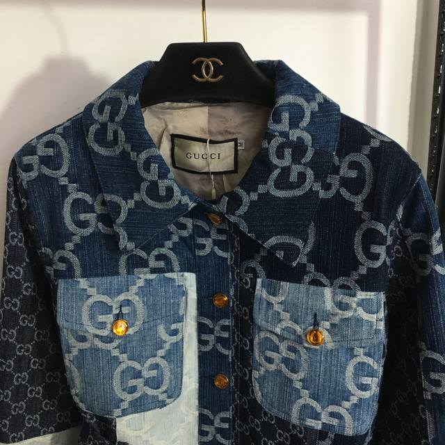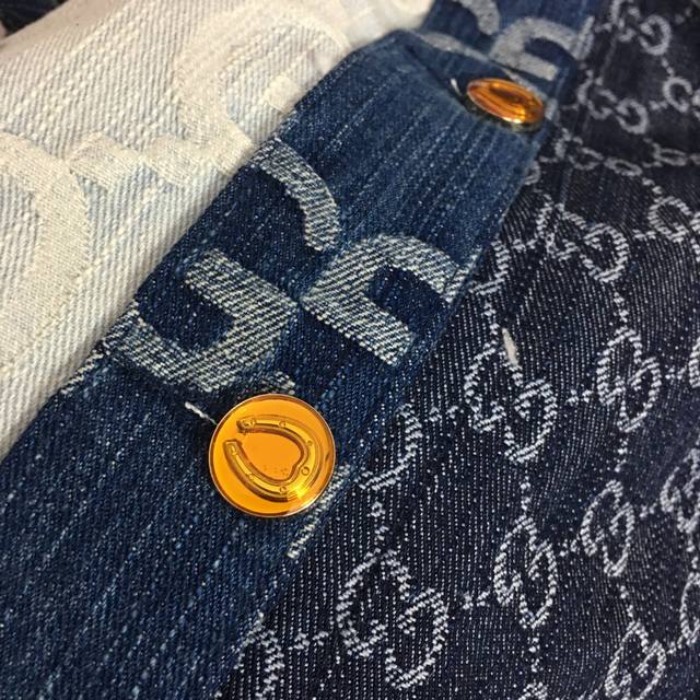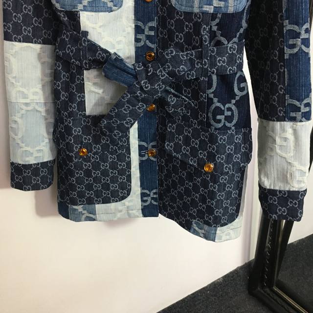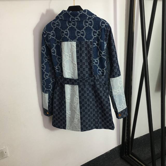 Style No. 5974 Gucc* New Double G jacquard color-blocked pocket patches and color-blocked stitching lace-up waist-cinching long-sleeved denim jacket, blue, sizes S-Xl, M; shoulder width 40, chest 104, sleeve length 62, length 76.
