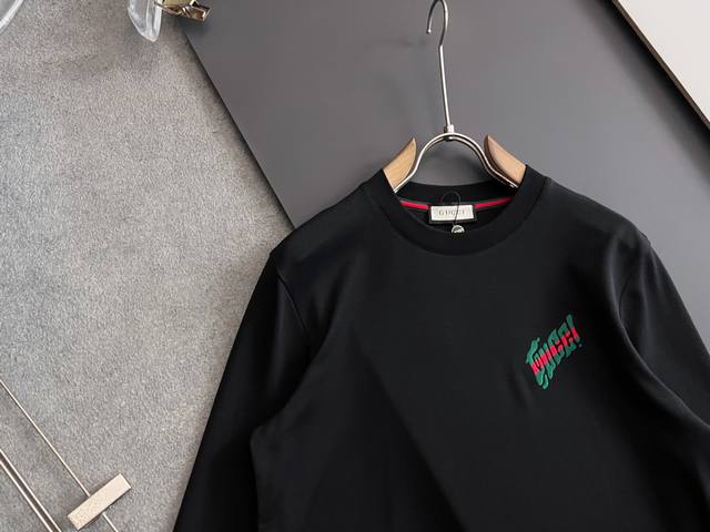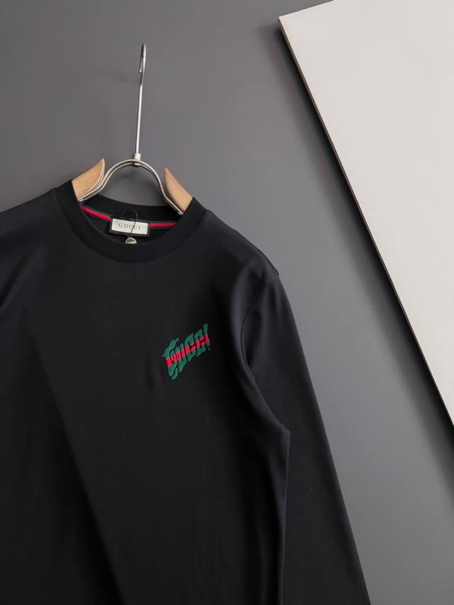 Gucc*, 2025 Autumn/Winter New Arrival Base Layer Shirt, High-Quality Item, Available in Department Stores. Made with premium lyocell and mulberry silk blend, featuring an inner webbing and inlay stripe for a very high-end feel. Stylish and casual round neck long-sleeved T-shirt with top-quality embroidered lettering and logo. Simple yet fashionable, extremely high-class, and looks great on. All tags are included. Two colors recommended. Sizes: M-3XL DDD