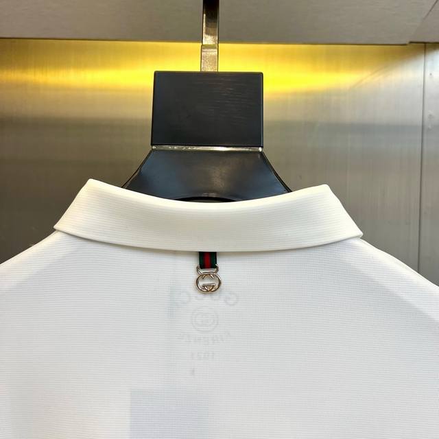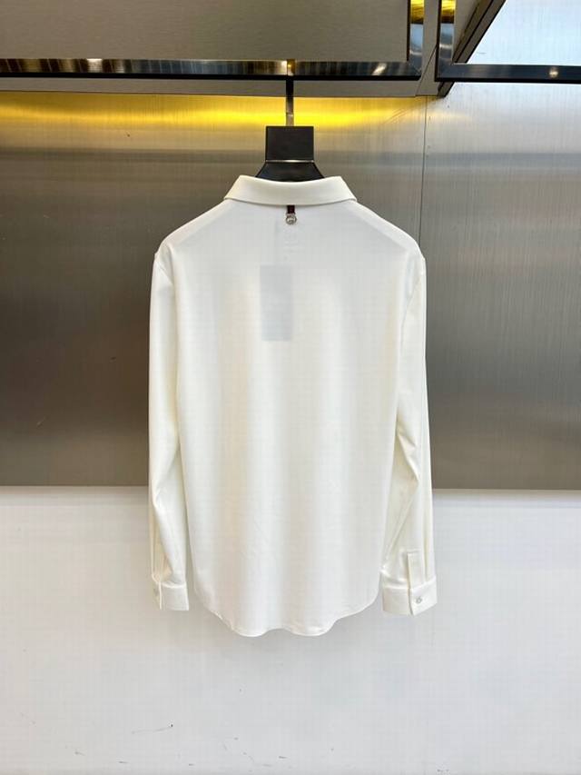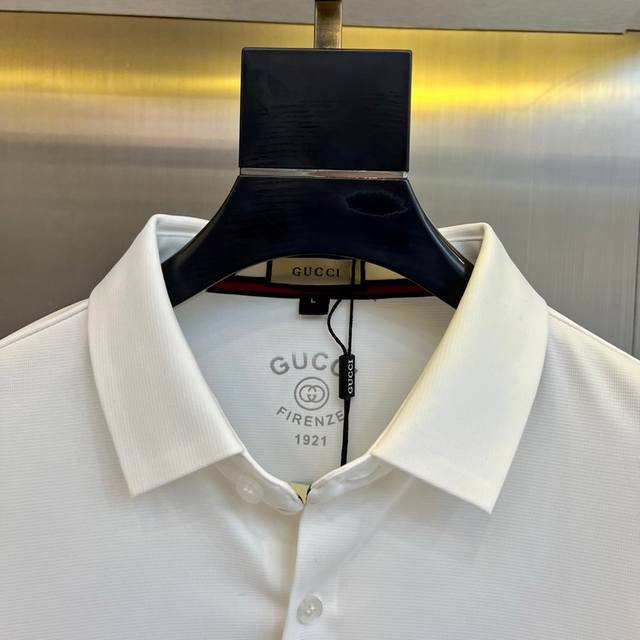 Gucc, a classic shirt from the Autumn/Winter 2025 collection. Woven with Italian craftsmanship, this modern wardrobe cornerstone embodies the philosophy of understated luxury. Classic Double G logo on the left chest: a red and green ribbon pays tribute to the brand's origins in Florence, and micro-embossing creates a three-dimensional texture. Concealed branding details: Gucci Roman script hot-stamped on the inside of the collar, with exclusive brand lettering on the hanger. Mother-of-pearl buttons: Selected 3mm thick, proven to remain secure after 200 opening and closing cycles. Sizes 48-56. Model is 173cm tall, weighs 143lbs, and wears a size 50.