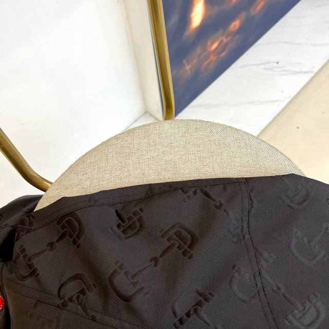. Matte black fabric features a 3D dark pattern, and high-grade polyester creates waterproof properties. The full zipper design is accented with a striking red drawstring, and contrasting color adjustment buckles enhance the overall look. Elastic cuffs contrast with the loose hem, and reflective strips are hidden on the back. The hanging system utilizes professional display hangers, while the champagne gold metal wall and warm lighting enhance the high-end feel. Model 48-56, 173cm tall, 143kg, wearing a size 50 Dm