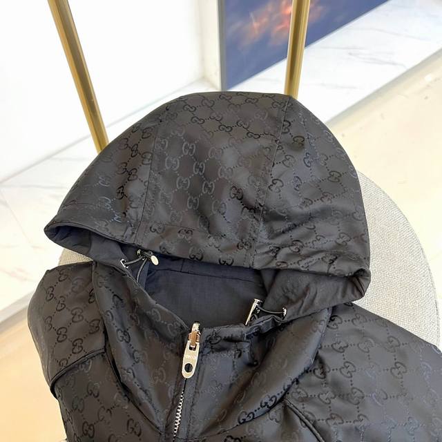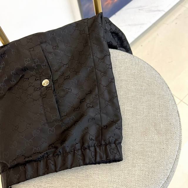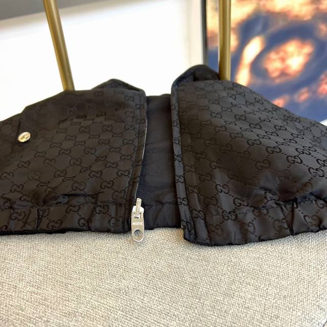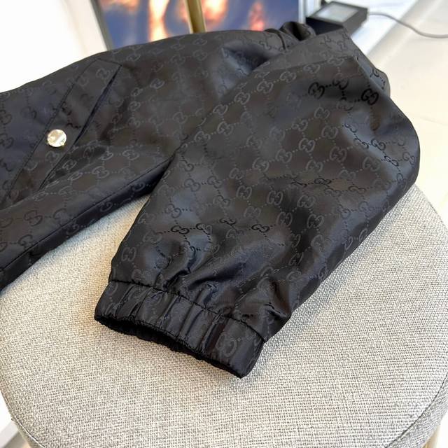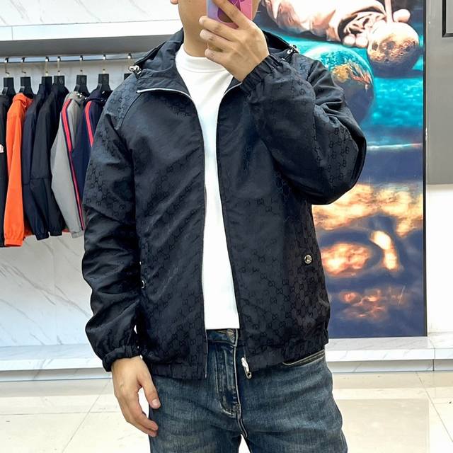 Gucc Gucci, the new Gucci double-sided jacket for autumn and winter 2025, interprets the brand's classic aesthetics with burgundy Gg printed fabric. One side is covered with the iconic Gg pattern, with a silver metal zipper and practical pockets with snaps; the other side is a solid color design, with red and blue striped details on the sleeves, a hooded design with metal eyelet decoration, showing a sporty and fashionable style. Both sides are made of high-tech functional fabrics with windproof and warm properties, and the cuffs and hem are designed with elastic edges. It can be worn reversibly to achieve two styles: the Gg printed side interprets retro luxury, and the solid color side creates a modern sporty style. Suitable for a variety of occasions such as urban socializing and leisure travel, it perfectly combines classic symbols with modern functionality with Italian craftsmanship, becoming a must-have item for fashionistas to layer in autumn and winter. 48-56 Model is 173cm tall and weighs 143 pounds, wearing size 50 Dm