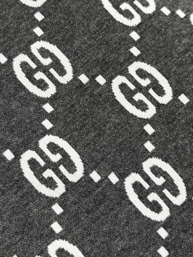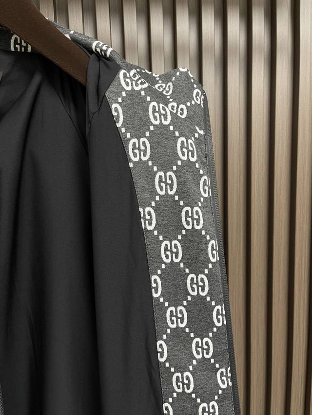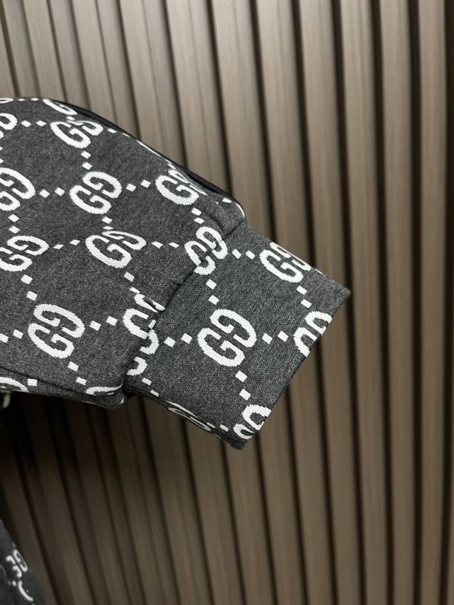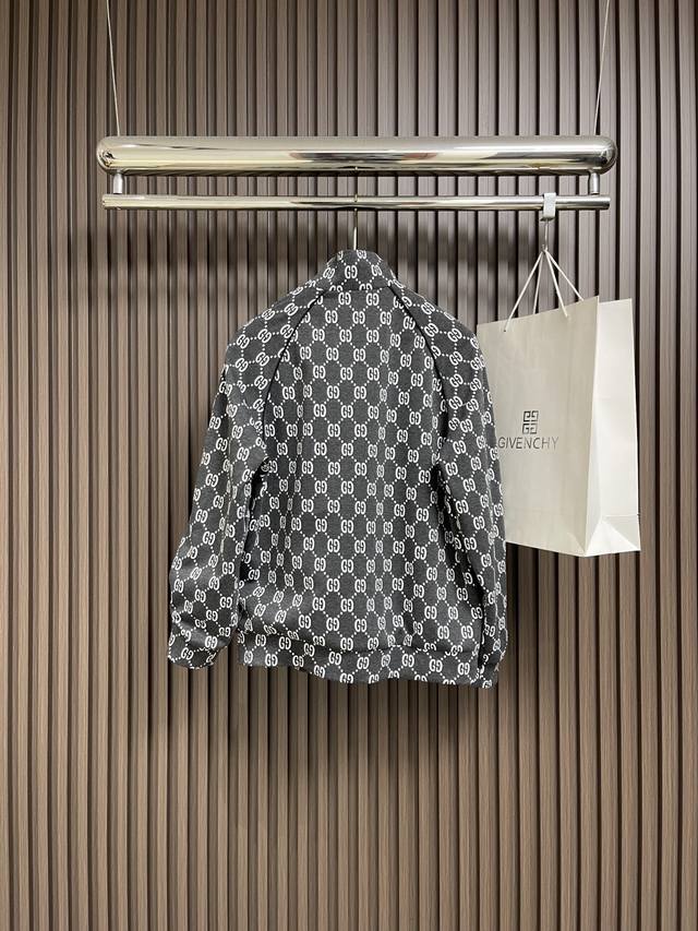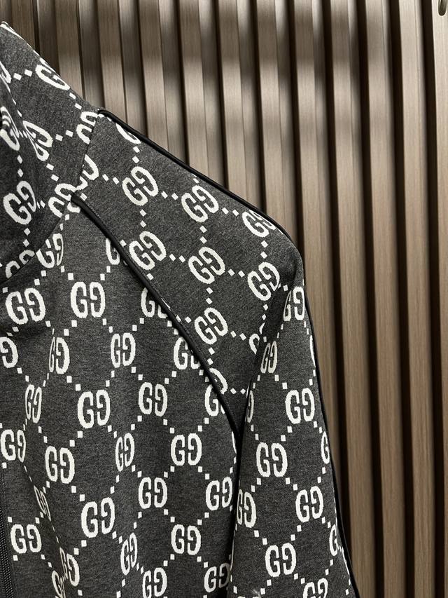 Gucci 2025S printed stand-up collar jacket, featuring a dark grey base covered with white double Glogo jacquard, and a premium cotton blend for a crisp silhouette. The full zip-up stand-up collar design with double side zipper pockets creates a great look! Going out: 48-56