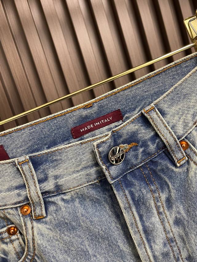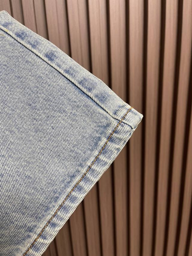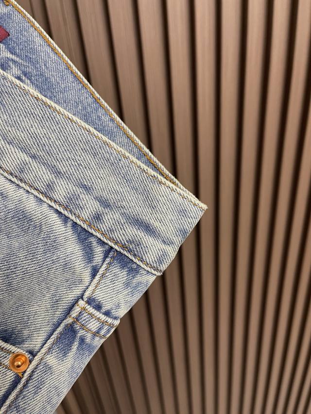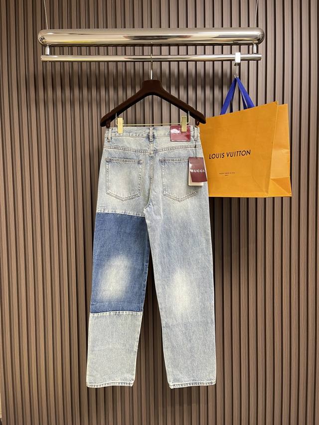 Gucci 2025Ss new patchwork loose-fit cotton denim jeans, this pair is crafted from light blue and blue bleached stone ink cotton denim fabric. Original development, metal hardware button opening and closing, decorated with the classic G leather patch at the back waist. The Gcuu series ingeniously integrates stripes, anchor patterns and brand logos, and the marine style design adds color to the casual silhouette, creating an ideal sea-style outfit. The subtle and restrained Gucci embossed logo makes this piece more perfect. The style is very novel and chic. Sizes: 30-31-32-33-34-36