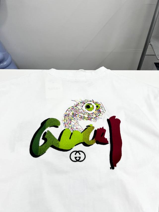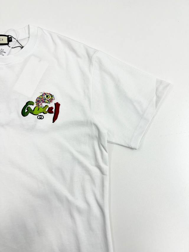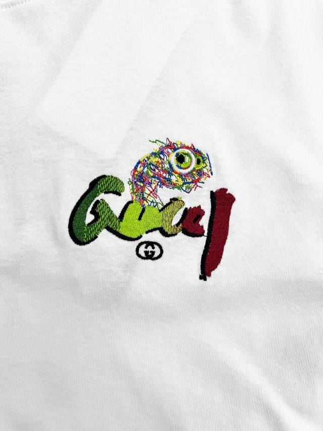 Gucci 25Ss new short-sleeve, the highest version of heavy craftsmanship classic embroidered logo pattern, high standard customization, the upper body is very stylish, imported high-end 280g pure cotton fabric with very delicate texture, exquisite details and exquisite craftsmanship, a highly plastic item that can be matched with any fashion, the version is super good, a must-have item for trendy men