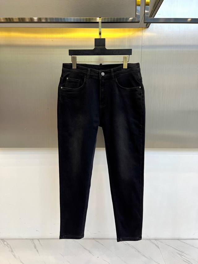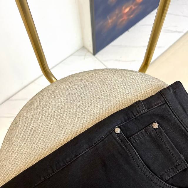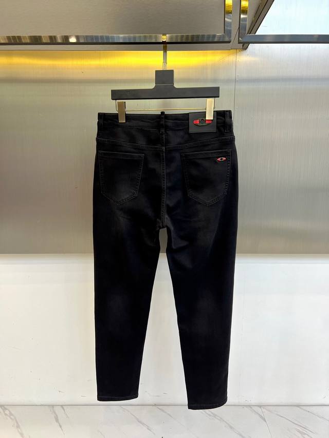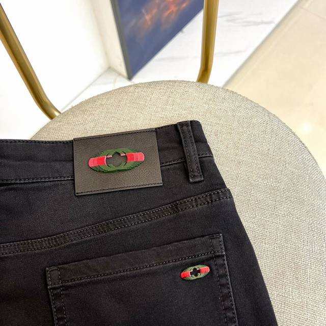 Gucci, Autumn/Winter 2025 new men's jeans. Revolutionary fabric technology reinvents the men's denim aesthetic! The slim straight-leg silhouette precisely outlines the leg. 33% regenerated cellulose fiber infused with Translucent Black technology creates a black color as deep and transparent as jet-black jade. 32.5% polyester fiber with 6% T400 elastomers and coffee carbon microparticles achieves a breakthrough in both warmth and stretch. The classic red and green webbing leather patch on the back waistband and the embroidered badge on the back pocket embody Italian luxury.