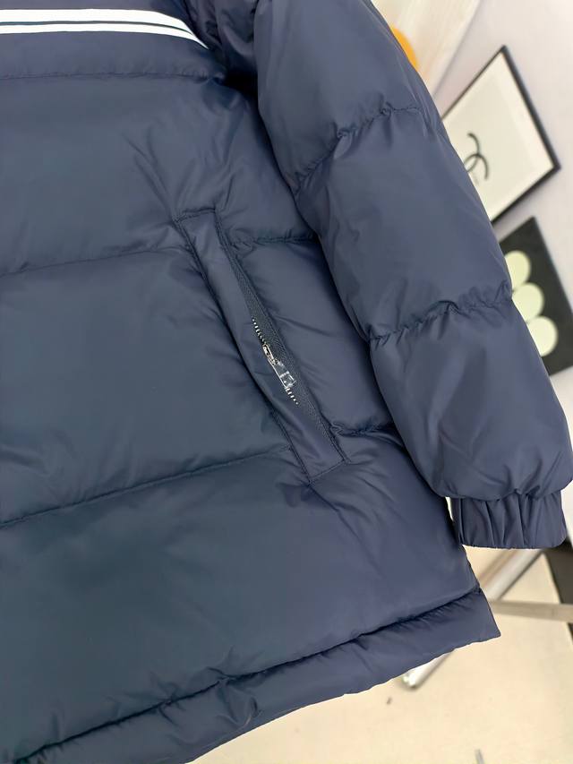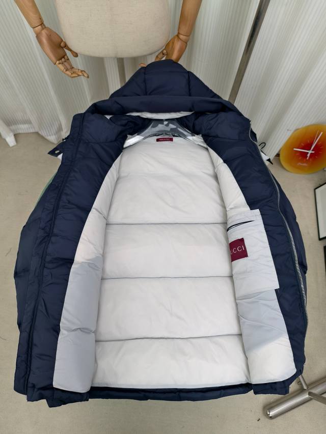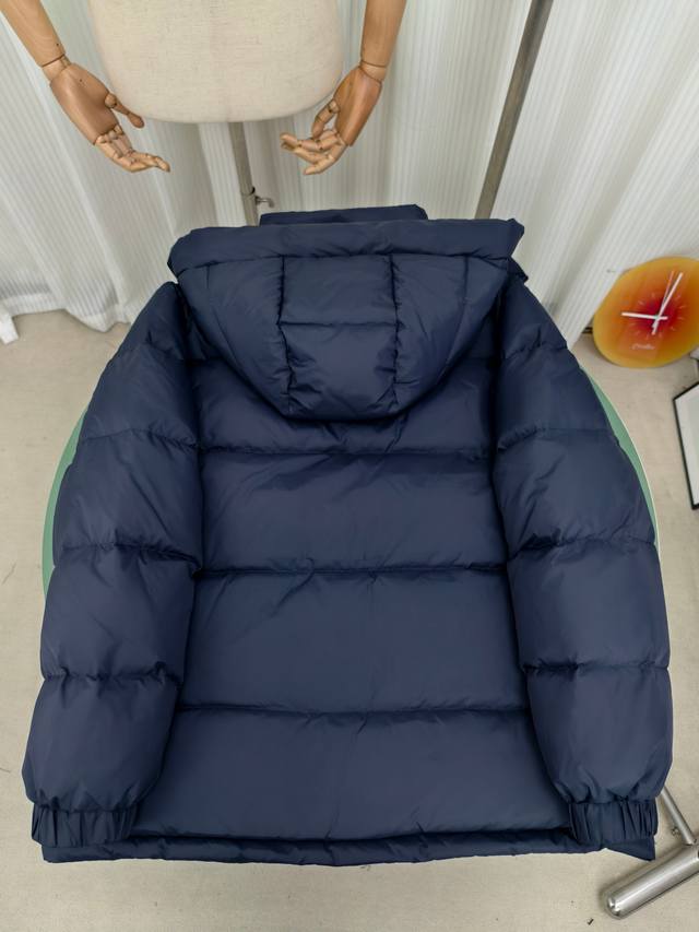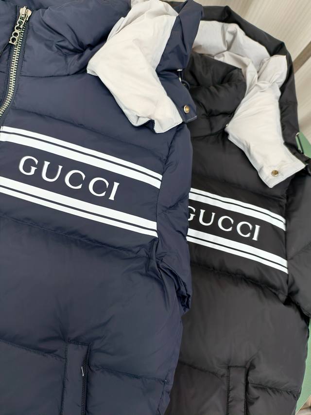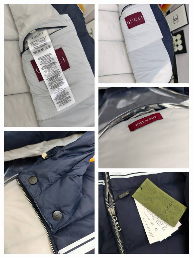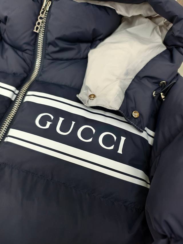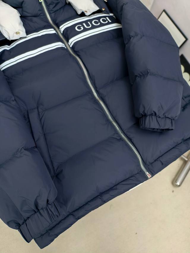 Gucci autumn/winter down jacket with detachable hood. This short down jacket is unisex. This Gucci hooded down jacket is unisex. This Gucci webbing down jacket is unisex. This black stand-up collar down coat features quilted nylon taffeta and the brand logo. Filled with white duck down, this jacket features top-notch craftsmanship, original hardware, and impeccable care labels. Colors: Black, Blue, and Sizes: 42, 44, 46, 48, and 50.