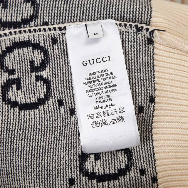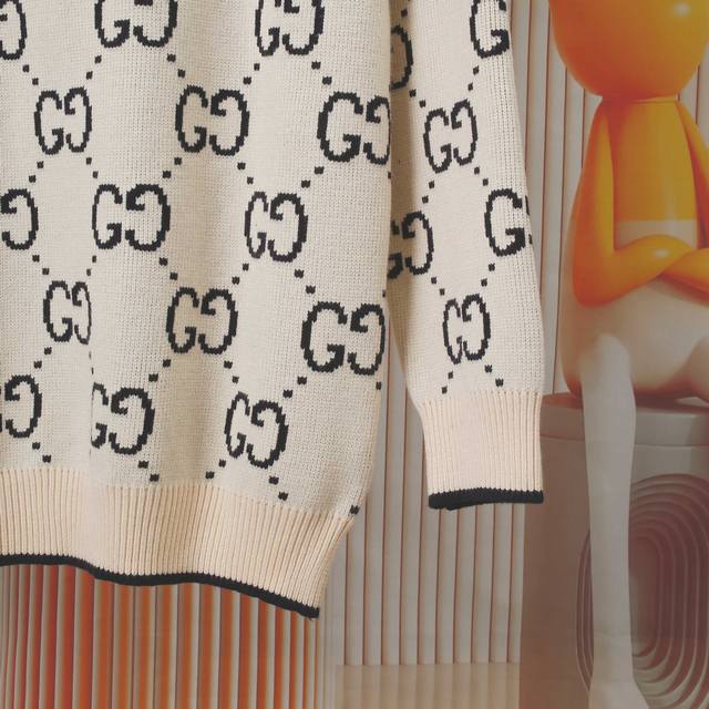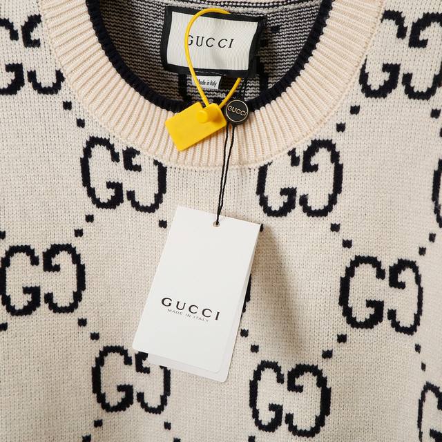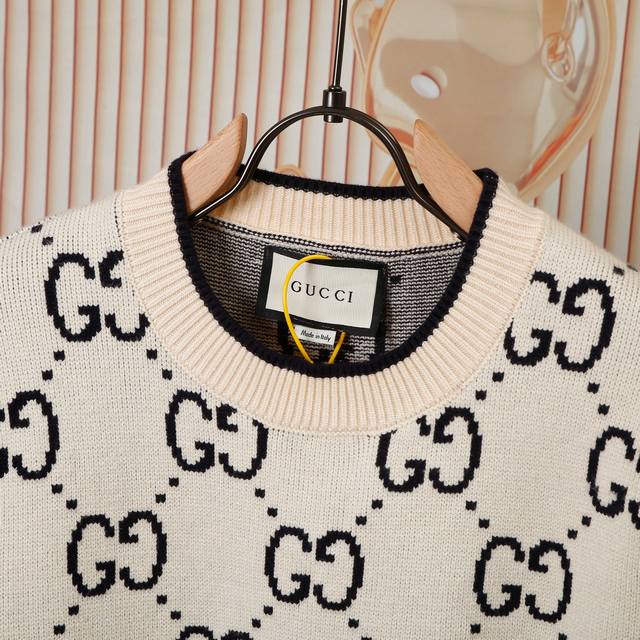 Gucci counters reproduce the top-of-the-line Gg wool jacquard sweater. This blue knit sweater features the Gg motif, inspired by the early diamond quilting pattern. This interwoven monogram pattern, first introduced in the 1970s, has become an essential and iconic element of the brand. Unisex, very trendy.