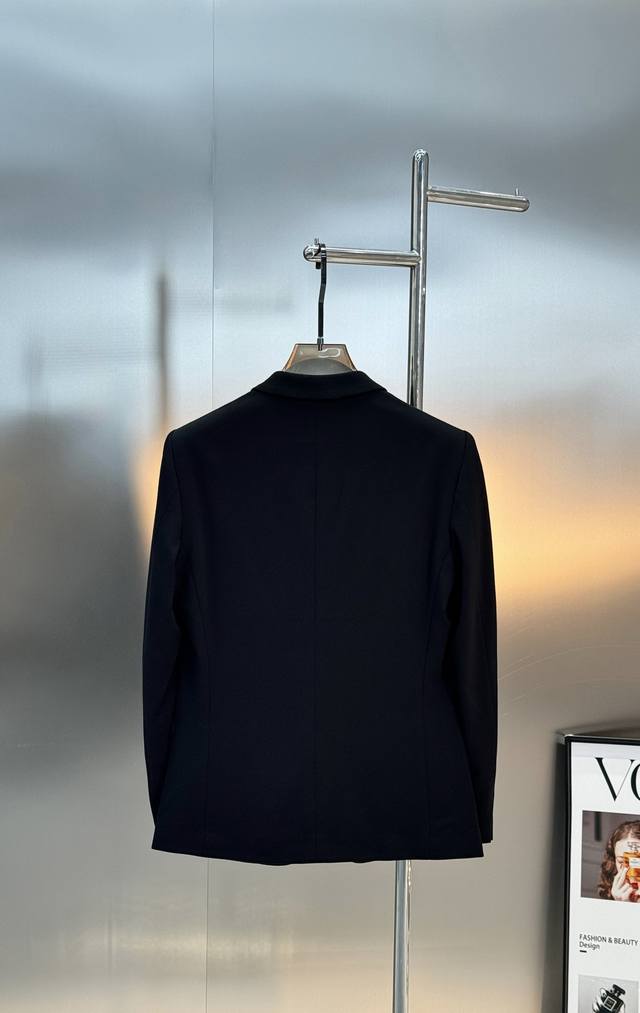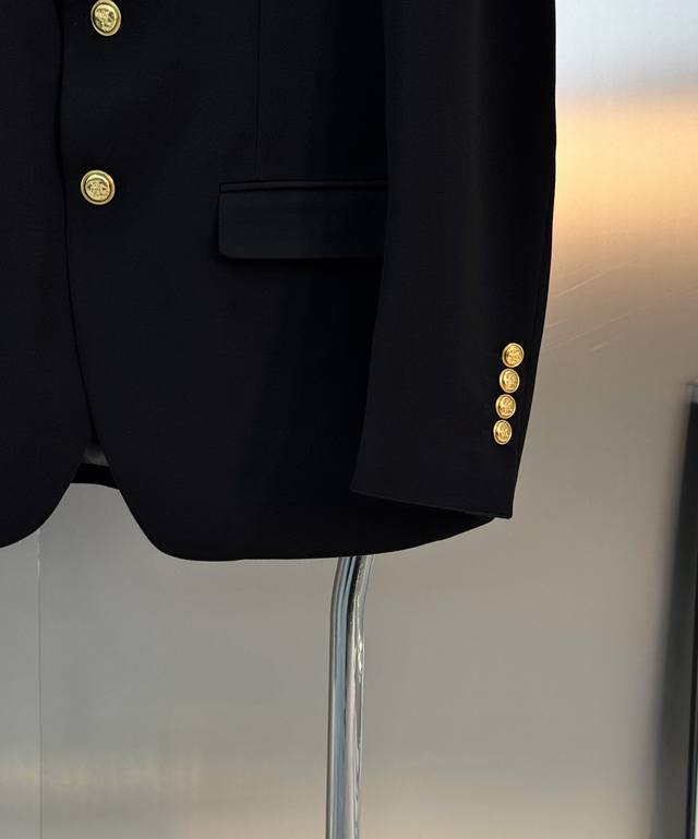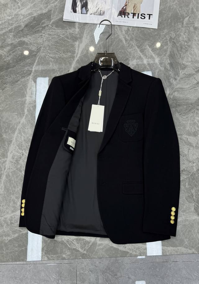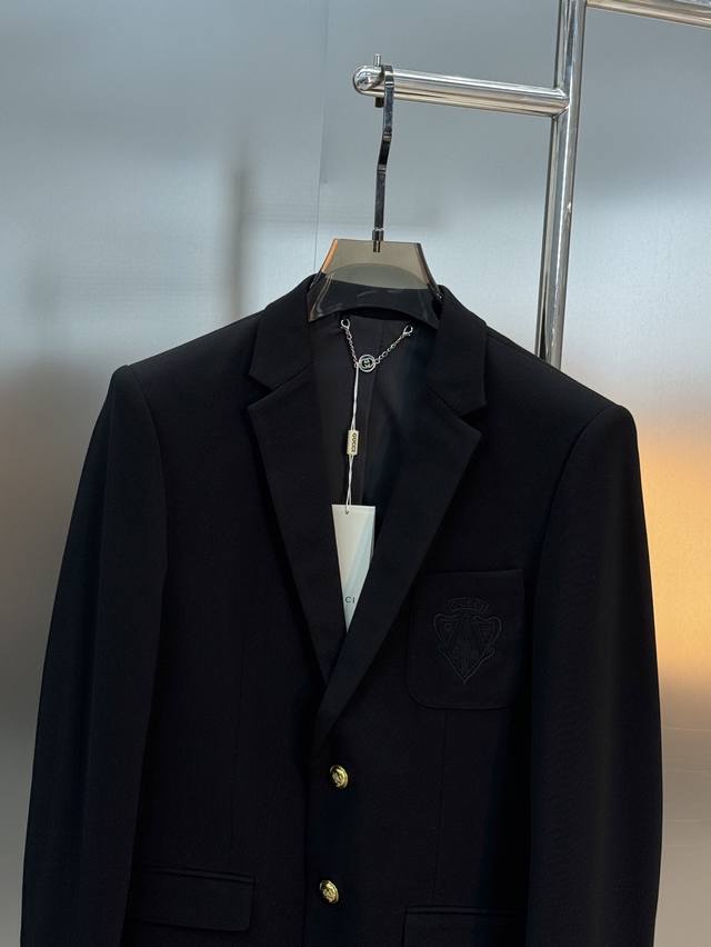 Gucci embroidered black classic suit, made in Italy. High-quality four-way stretch fabric. Classic blazer design with gold buttons and an embroidered badge on the chest, exuding a retro and sophisticated feel. The clean cut makes it easy to wear for both commuting and everyday occasions, effortlessly switching between a preppy or professional look. The embroidered details on the chest are highly distinctive, and it pairs beautifully with pleated skirts or jeans, combining youthful energy with a touch of elegance. Sizes: M-3XL (slim fit), 4XL (custom sizes available). For someone 175cm tall and weighing 145kg, XL is recommended.