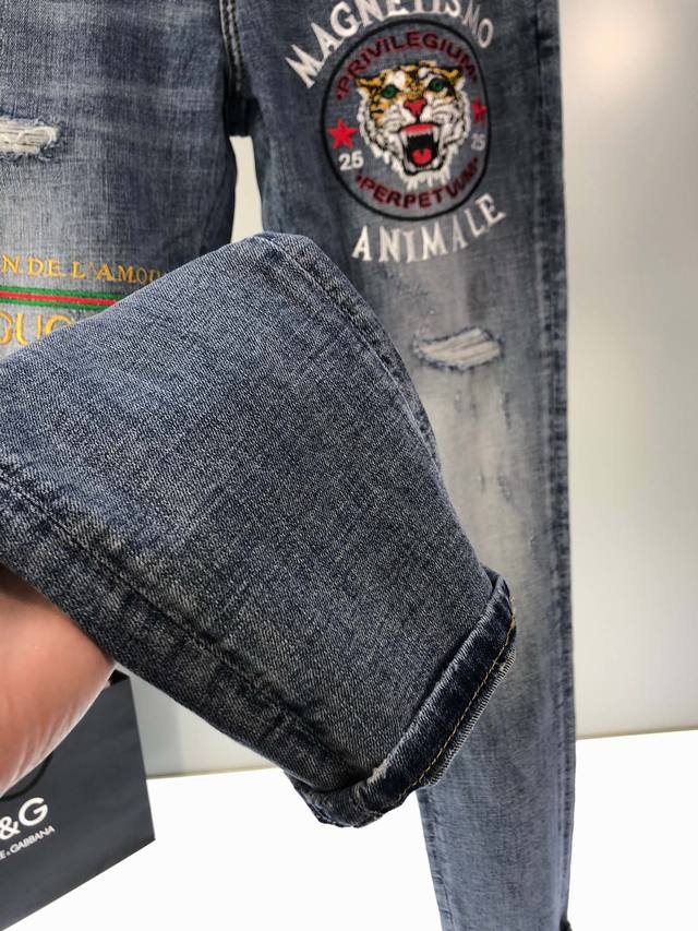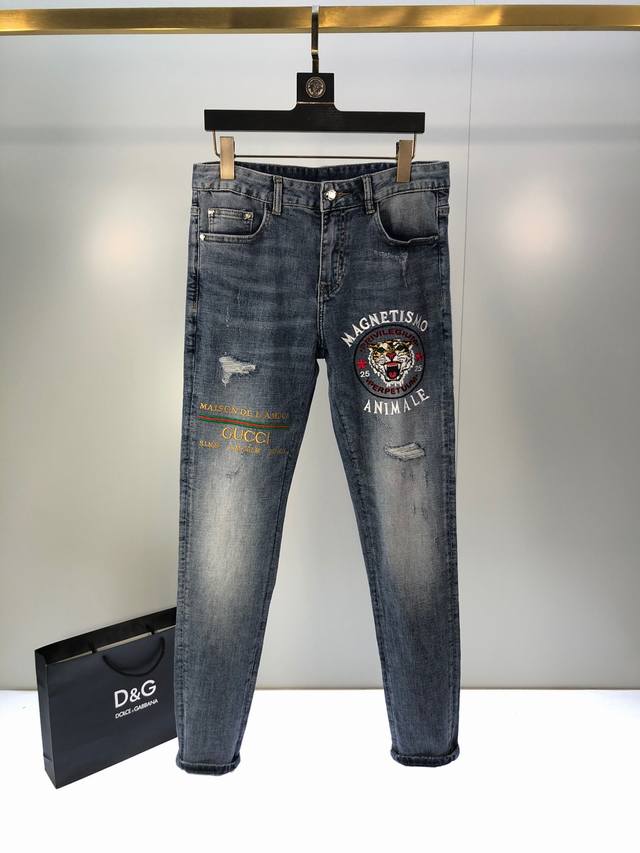High-quality, featuring Gucci's best-selling styles. New spring/summer men's jeans, featuring slightly stretchy fabric, exclusively available on the official website. Fashionable, elegant, minimalist, and versatile, this collection features a natural yeast wash process. Made from imported heavyweight denim, it features designer hardware, genuine leather patches, and exquisite stitching. A must-have. Sizes: 28-38