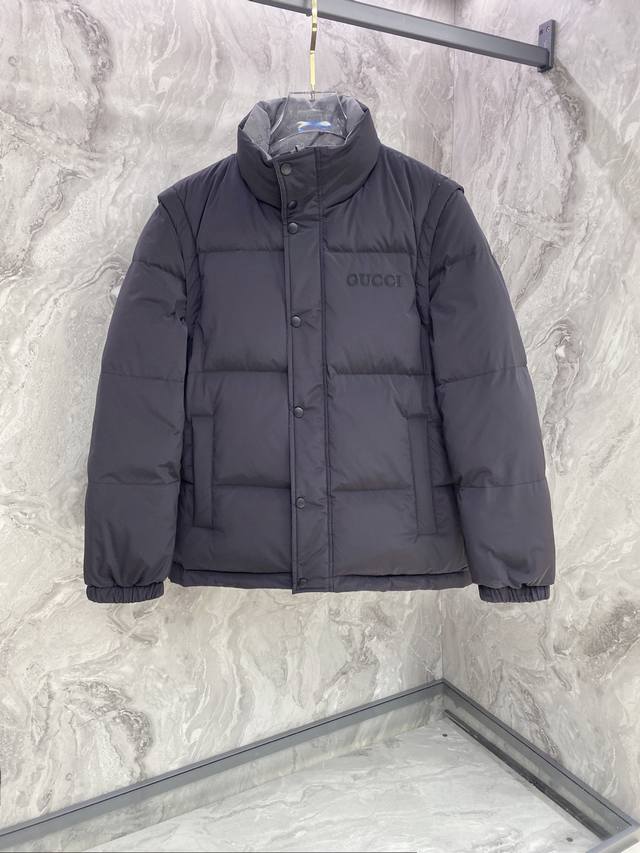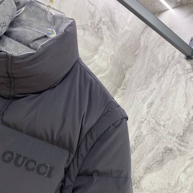 Hot-selling down jacket, reversible with detachable sleeves. Gucci 2025 new down jacket, runway new arrival. Detachable sleeves, four ways to wear. Perfect condition, made with high-tech waterproof fabric, filled with 95% white duck down for comfort and warmth. Rich and attractive color, a very outstanding design that easily elevates your style. Exquisite and meticulous workmanship, with neat and fine stitching! A masterpiece by a top designer! Not bulky, super stylish! Available in sizes 48-56.