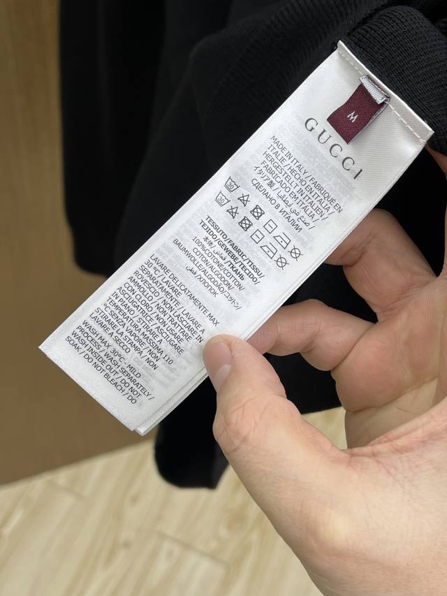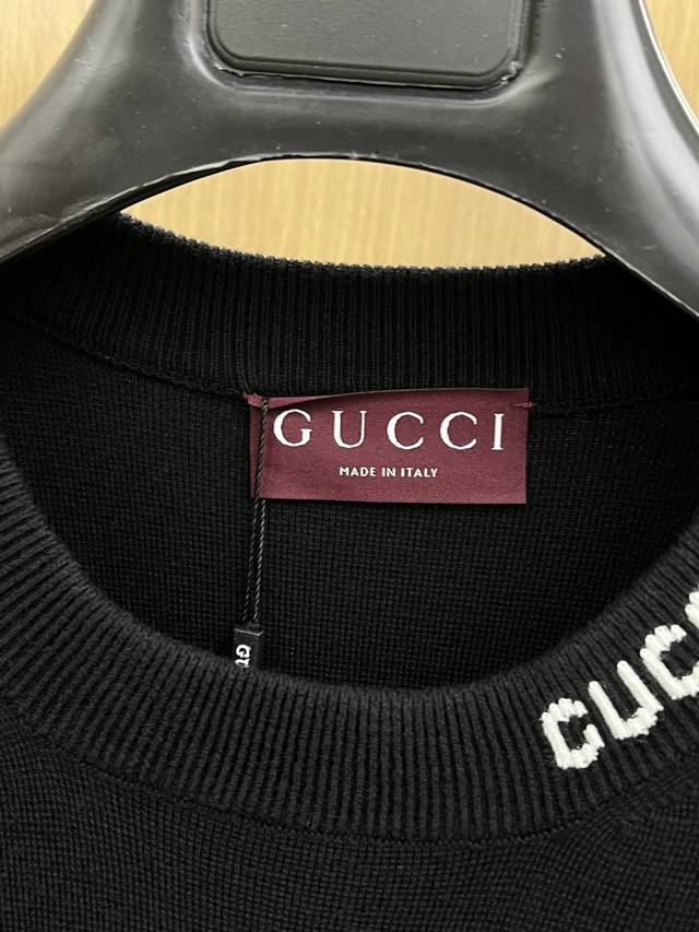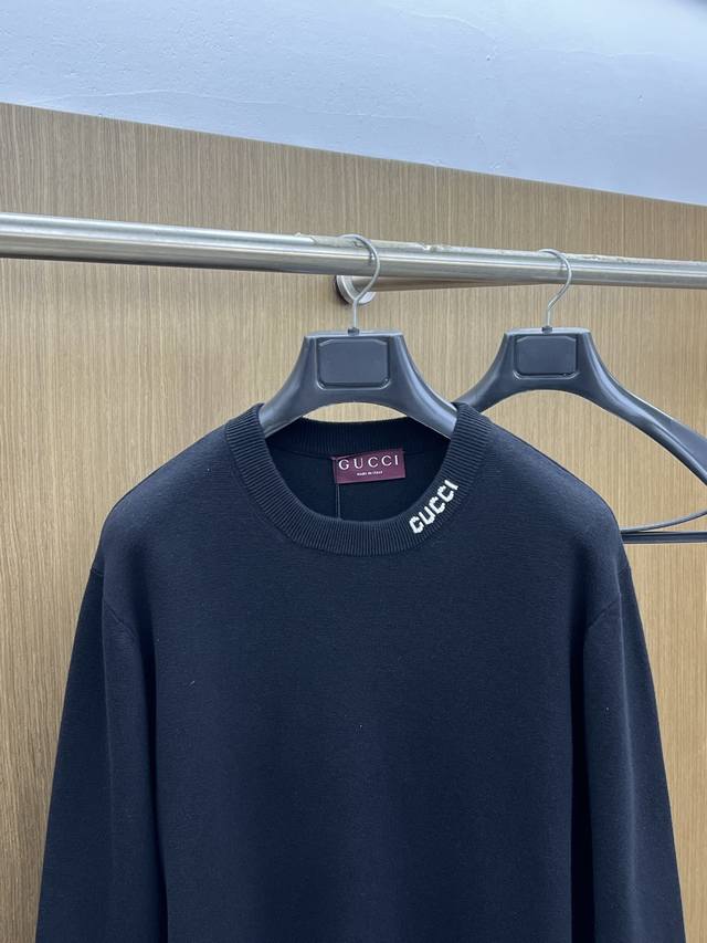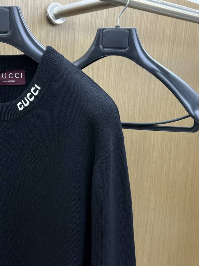 New Gucci black knitwear. A minimalist black top with the Gucci logo subtly hidden, the Gucci logo at the neck is the perfect finishing touch. Classic black meets Gucci, achieving a perfect balance of effortless luxury. The simple black tone outlines a relaxed posture, while the Gucci logo at the neck subtly adds a touch of elegance, incorporating the details of an Italian luxury brand into a basic knitwear piece. The pure black knit texture, paired with the brand's iconic lettering design, gives everyday wear a low-key feel while concealing an understated brand style. Gucci effortlessly strikes a balance between casual and sophisticated. Color: Black Sizes: S-XL