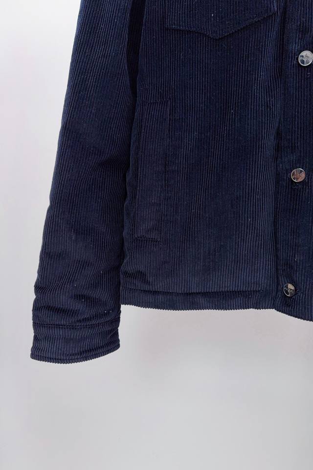 . Imported corduroy fabric with a cotton plaid lining. The collar is made of cowhide leather. Authentic hardware and accessories are from a major manufacturer, with fine workmanship. The placket and pockets are embellished with metal buckles. The chest pocket is embroidered with lettering. The logo is made using a positioning embroidery technique and a fully three-dimensional process using imported German machines.