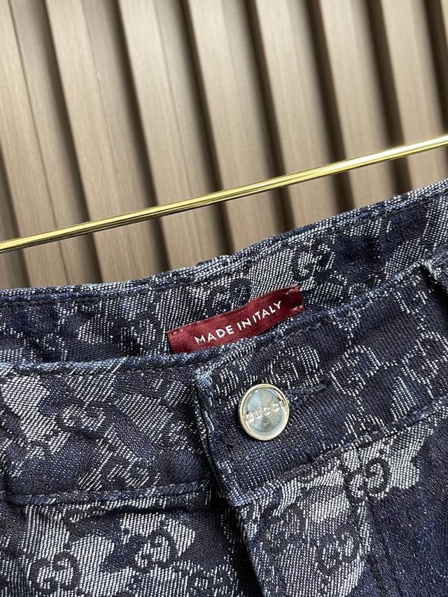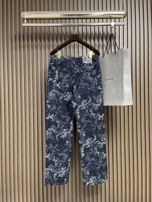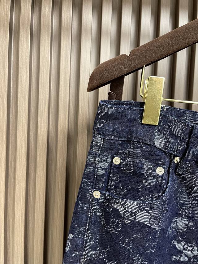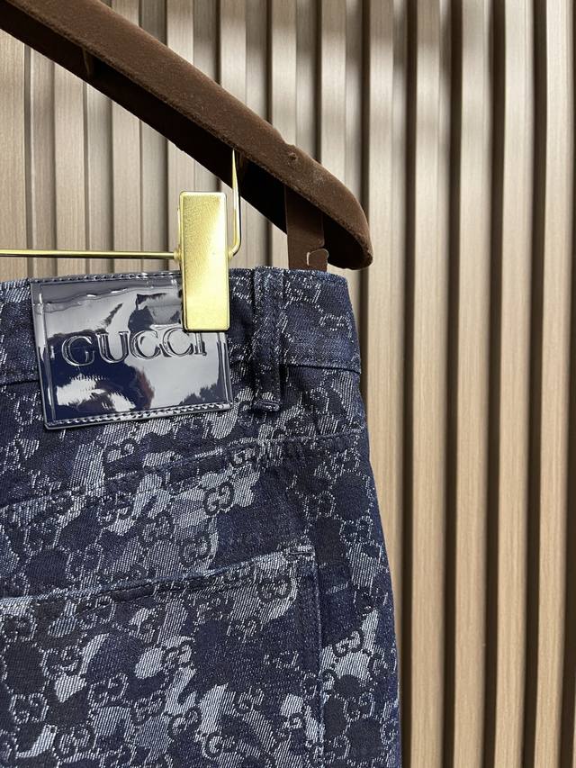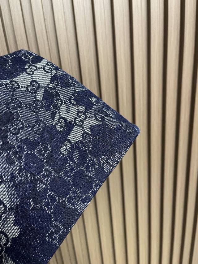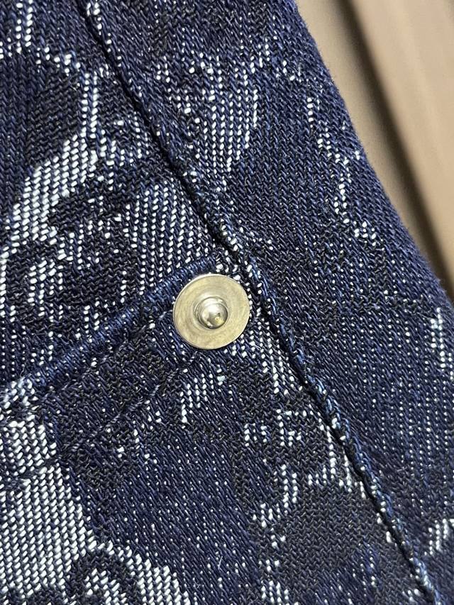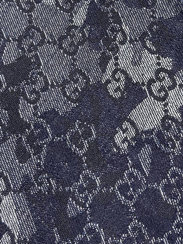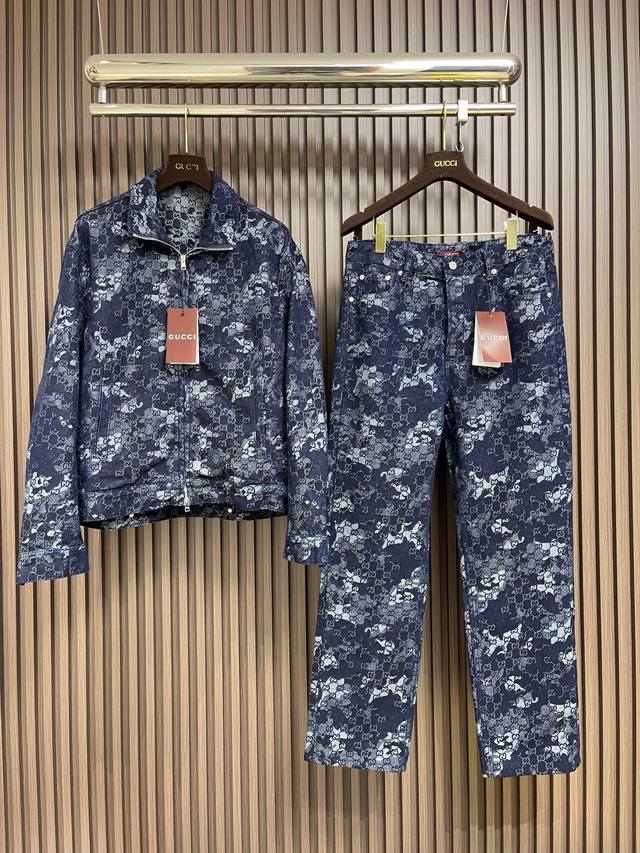 Gucci all-over jacquard denim jacket, outerwear, and jeans set. The custom-made denim jacquard denim is as soft as cotton and comfortable against the skin. A dark blue base with ivory white highlights weaves a flowing, luxurious all-over marble-effect pattern through the denim warp and weft. This pattern complements the leather label on the back, adding brand recognition. The zipper interprets the luxurious grammar of opening and closing, daring to break the rules to create a walking work of art. This elegant set embodies a luxurious and trendy style. The jacquard process creates a marble effect on the fabric surface, precisely controlling the interweaving of the warp and weft threads and achieving a more three-dimensional effect. The electrolytic dark blue + stone mill fermentation washing process prioritizes electrochemical reactions to change the fabric's color. The fabric is then mixed with abrasives in a grinder and washed in hot water to achieve a specific washing effect. The double wash and light stir-fry process first desizes and cleans the denim before sandwashing to produce a fading effect. The special chemical treatment stirs the colors to create a special contrasting effect. Size: Tops 44-46-48-50 Pants 34-36-38-40 Corresponding to S-Xl