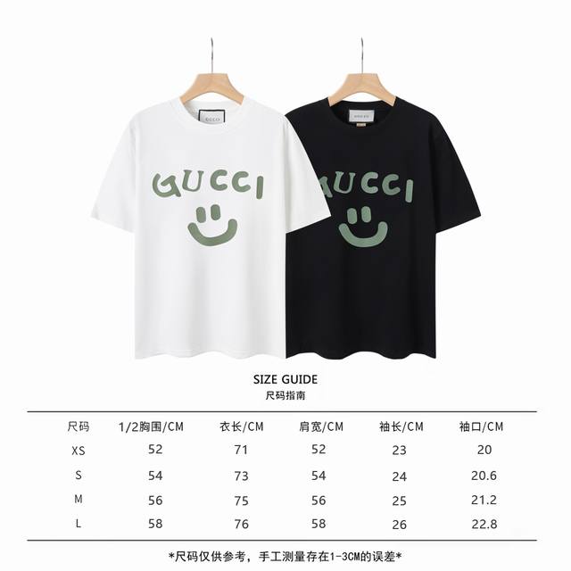 8852# Gu smiley face print, Gucci's latest short sleeves for spring and summer 2025! ! The latest model from the counter! New on the official website! ! High quality and high version from the counter. Super iconic colorful brand logo print pattern. Paired with sneakers, fresh and comfortable. Suitable for layering when shopping or dating. It looks like a blogger. Low-key and tasteful. Original fabric 2 grams G high weight double yarn 100% combed cotton thread fixed weaving and dyeing. No color difference in and out of the counter. No pressure. Shoulder-through drawing process increases the washing life of clothes. No deformation. High version digital printing process. No fading. Bright colors. The same style as celebrities. No age, no figure, no gender. Super eye-catching and fashionable. Very comfortable to the touch. Super strong texture. Fashionable and individual. Super versatile. Good-looking. A must-have for everyone. Better for couples. Hanging tag, collar label, washed wheat, three labels are complete! !
