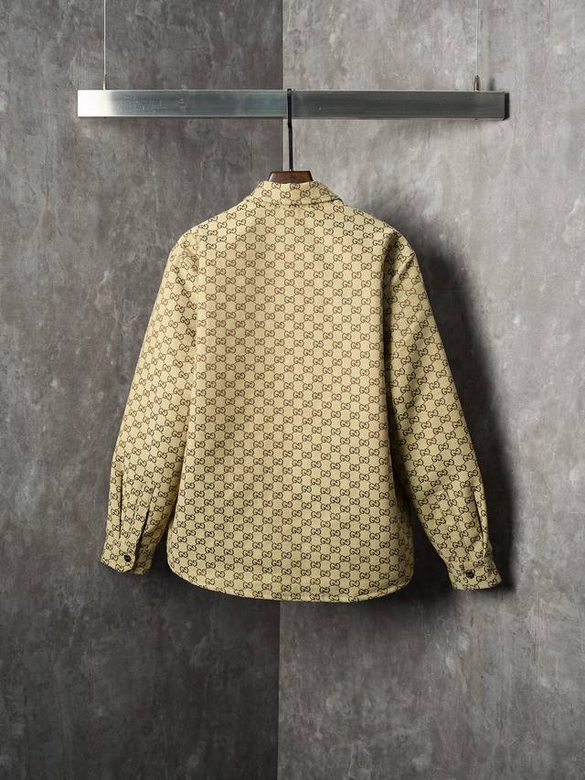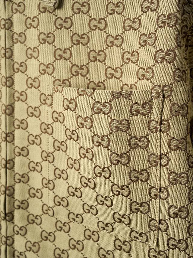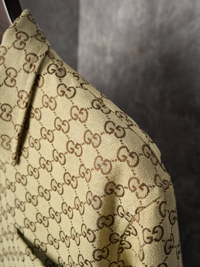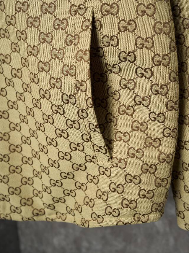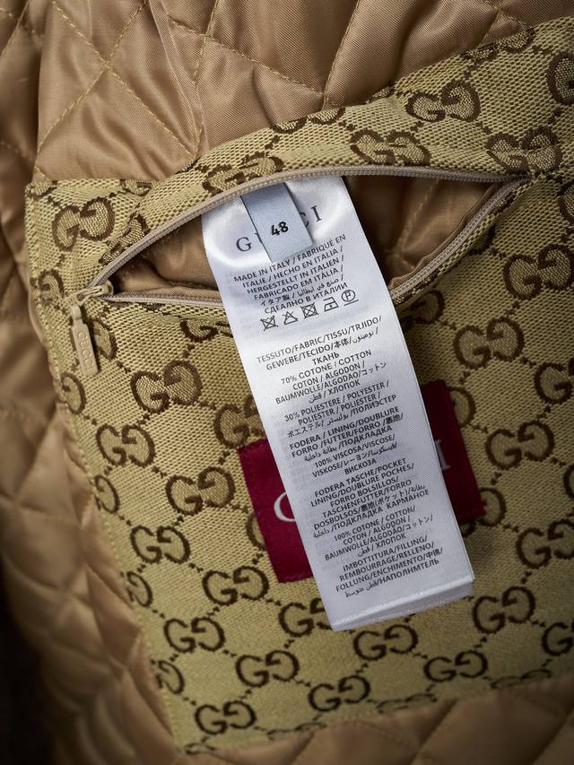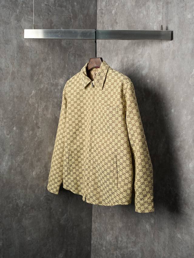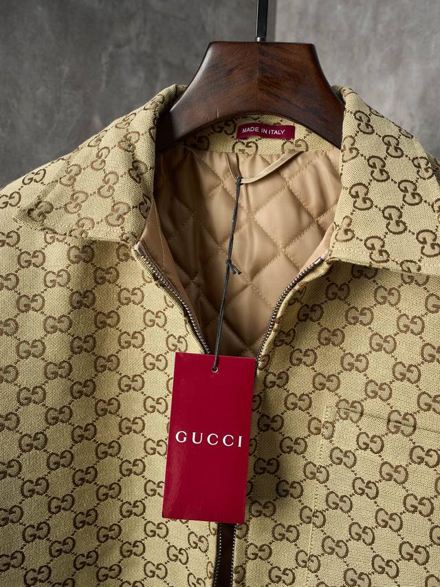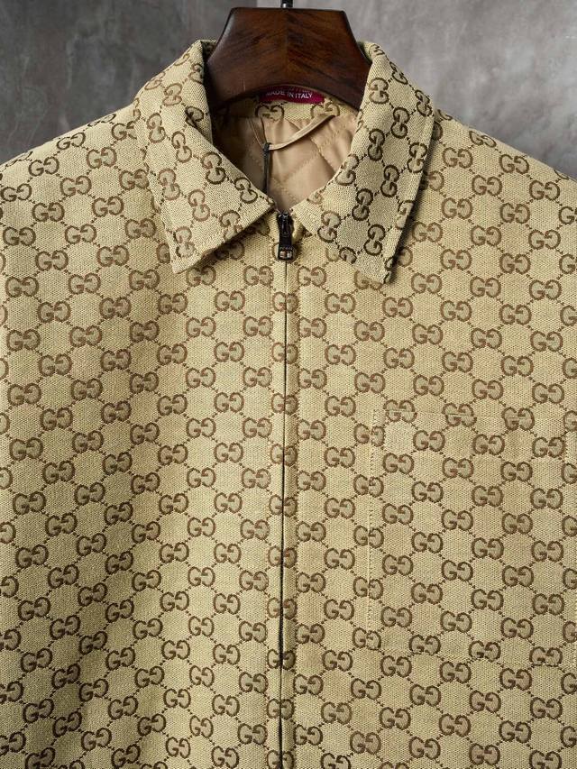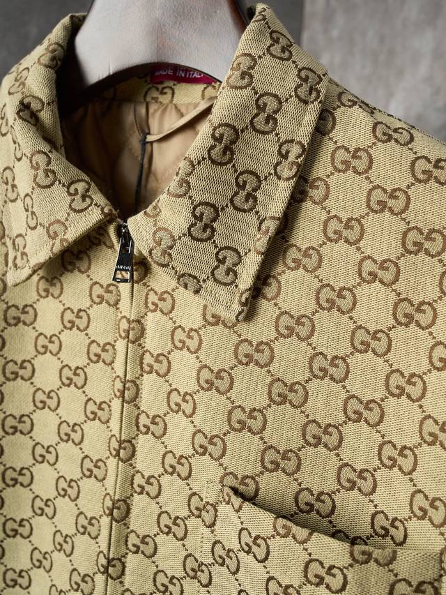 Actual product hanging photo of Gucci Gg jacquard canvas zip-up collar jacket DDD Ddd In stock SML XL DDD Ddd In this collection, the signature Gg pattern is presented through different textile techniques, creating a rich visual effect. DDD This zip-up jacket is crafted from khaki Gg canvas, DDD with a quilted lining for a comfortable silhouette, and a zip-up front for a charming piece. Gg canvas lining, collar, pockets, sleeves, chain front DDD