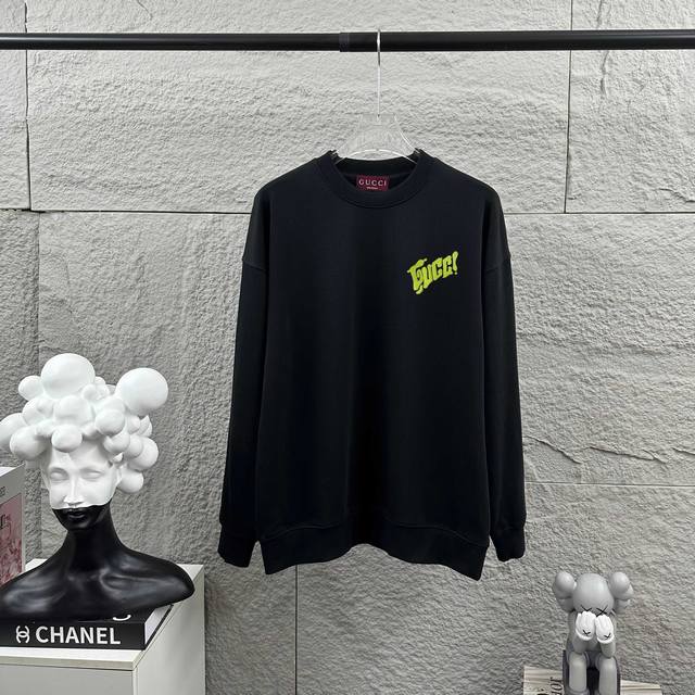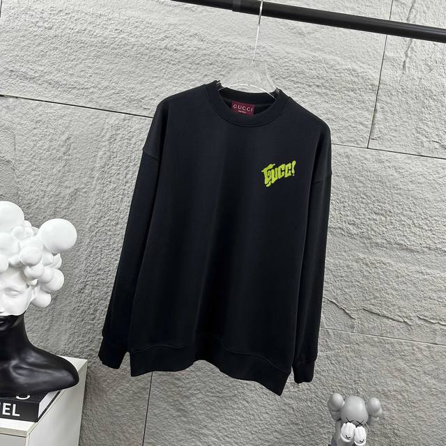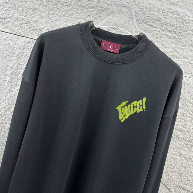 Gu* Gucci*2025 Early Autumn/Winter New Style Double G Chest Gucci Simple Green Letter Embroidery + Print Long Sleeve Crew Neck Sweatshirt Custom Terry Fabric Unisex