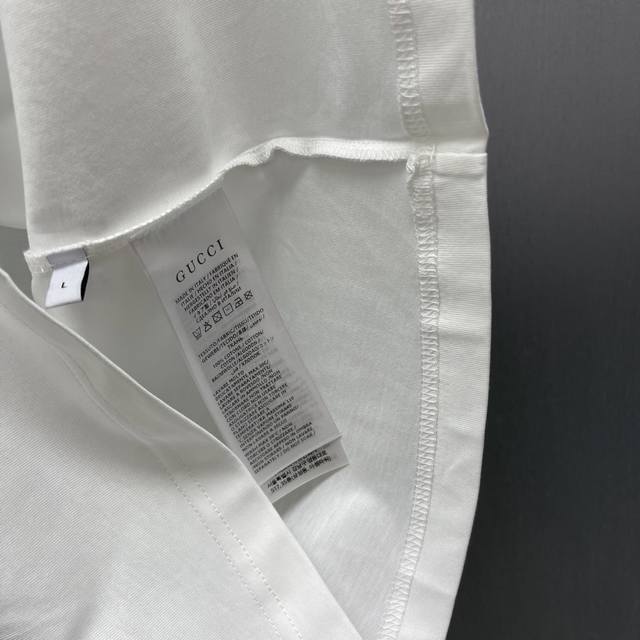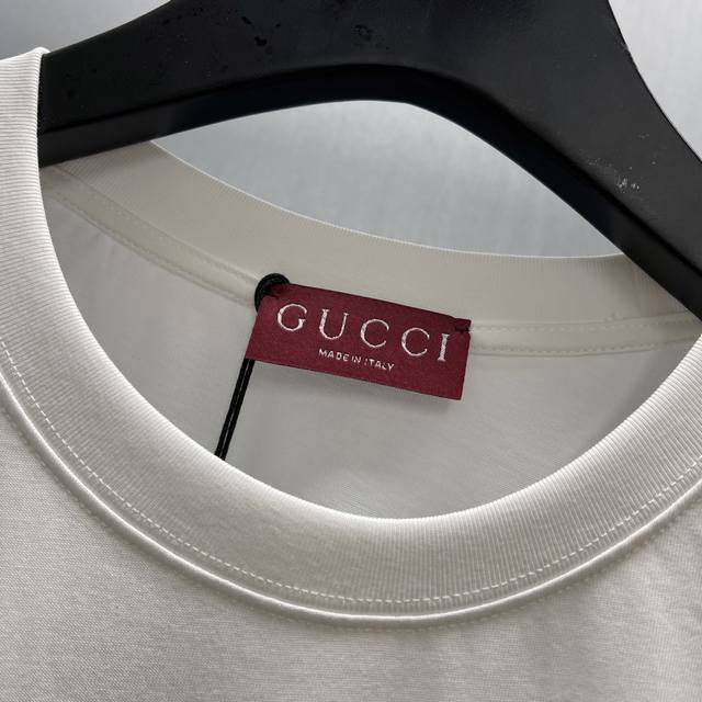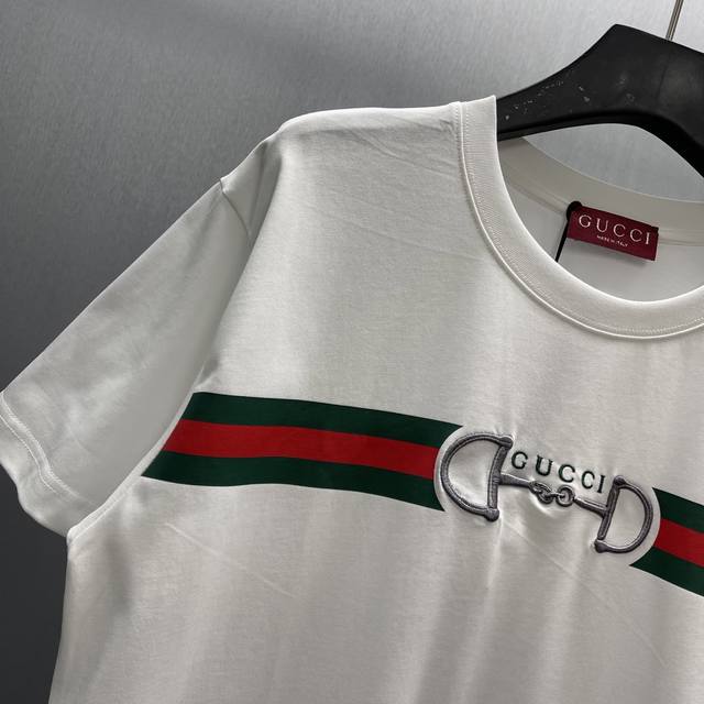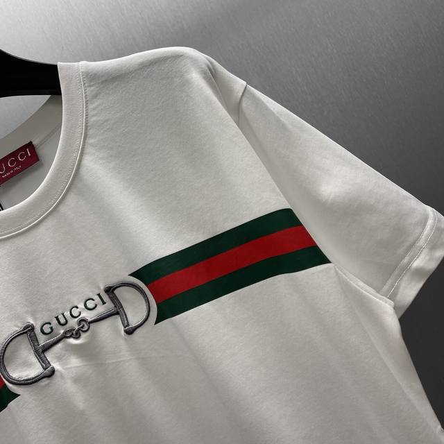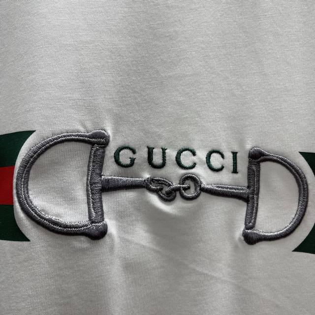 Gu Printed Fleece Knit Cotton T-Shirt (Size: S-XL) The brand's elements are cleverly integrated into the silhouette, fabric, and craftsmanship, continuing the brand's heritage and interpreting contemporary aesthetics. This fleece knit cotton T-shirt features a ribbon print and Gucci horsebit embroidery, showcasing exquisite charm.