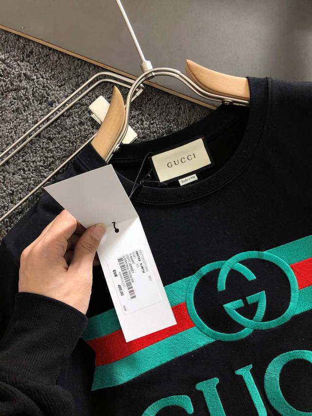 Gucc, 2020 New Year's hottest unisex black gift bag style, double G print embroidered short-sleeved T-shirt, made of pure cotton, complete with all three tags, boutique style, top-quality print, comfortable fabric, a must-have, made with imported high-end custom fabric, imported silk thread for a first-class feel! High-end imported printed handicraft, imported dyes that won't fade, sold in high-end boutiques! Sizes: Xs-L (Restocked)