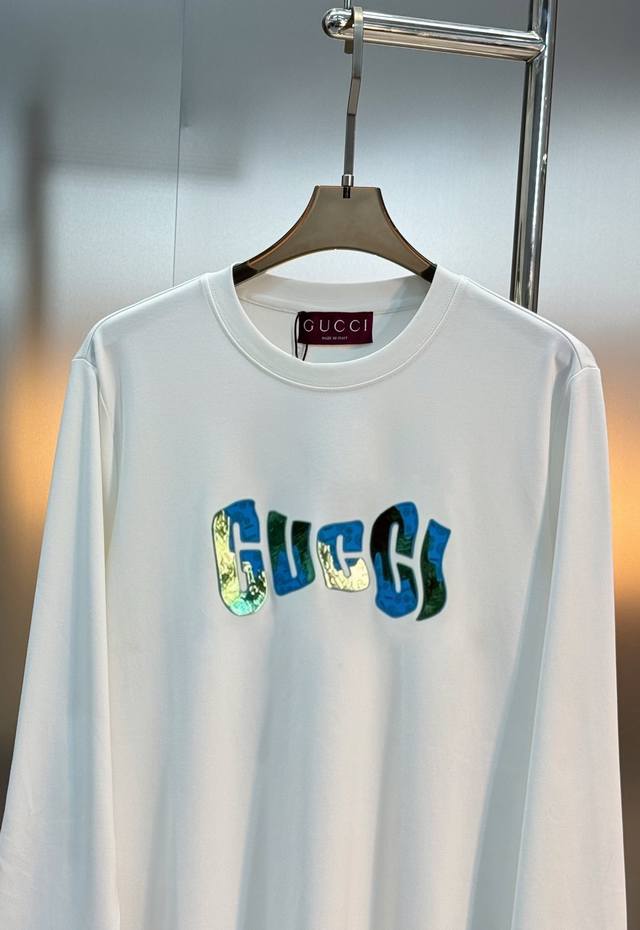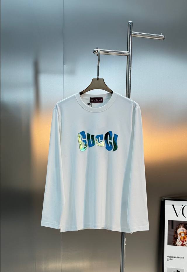 Gucc*Gu-Qi 25S New Modal Long-Sleeve T-Shirt. A very fun visual effect!!! The classic colorful logo on the chest is time-consuming and labor-intensive, using a double-layer heat transfer process. Each piece is a rare high-quality item. Made with premium 300g modal fabric, it's comfortable and soft, offering an extremely skin-friendly wearing experience. The basic, regular crew neck cut is stylish whether worn alone or layered! All three labels are present! Colors: Black, White. Sizes: M-3XL Slim fit! S and 4XL can be custom-made. For someone 175cm tall and weighing 140kg, L is recommended.