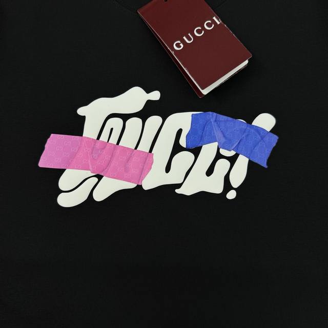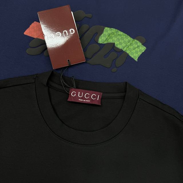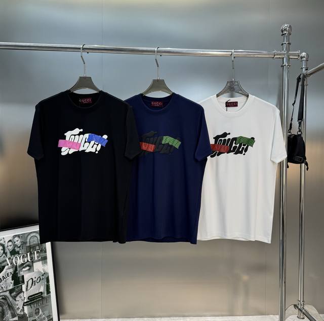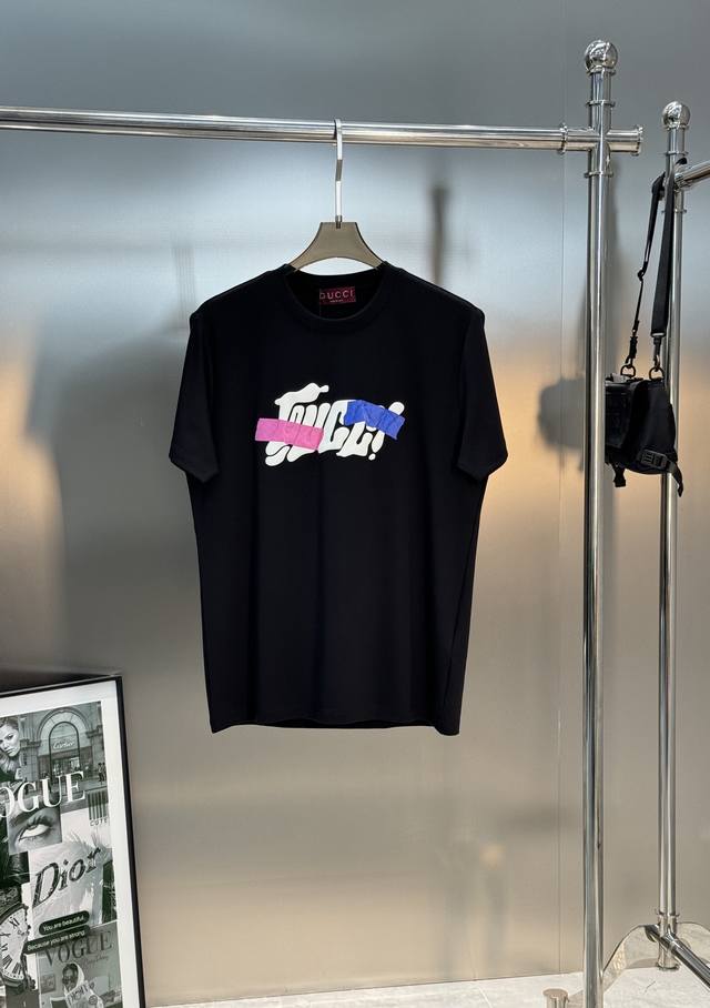 Gucc*Gu-Qi 25S New Modal T-Shirt. A very fun visual effect!!! The classic colorful logo on the chest is time-consuming and labor-intensive, using a double-layer heat transfer process. Each piece is a rare high-quality item. Made with premium 300g modal fabric, it's comfortable and soft, offering an extremely skin-friendly wearing experience. The basic crew neck cut is stylish whether worn alone or layered! All three labels are present! Colors: Black, White, Dark Blue. Sizes: M-3XL Slim fit! S and 4XL can be custom-made. For someone 175cm tall and weighing 140kg, L, D, or D are recommended.