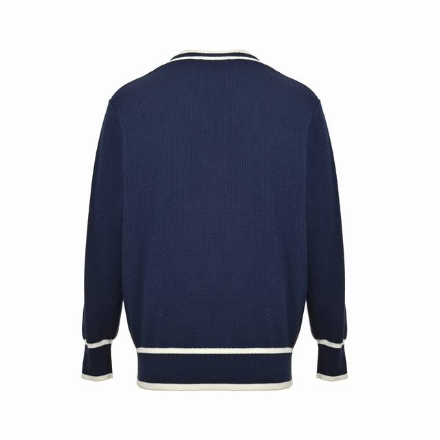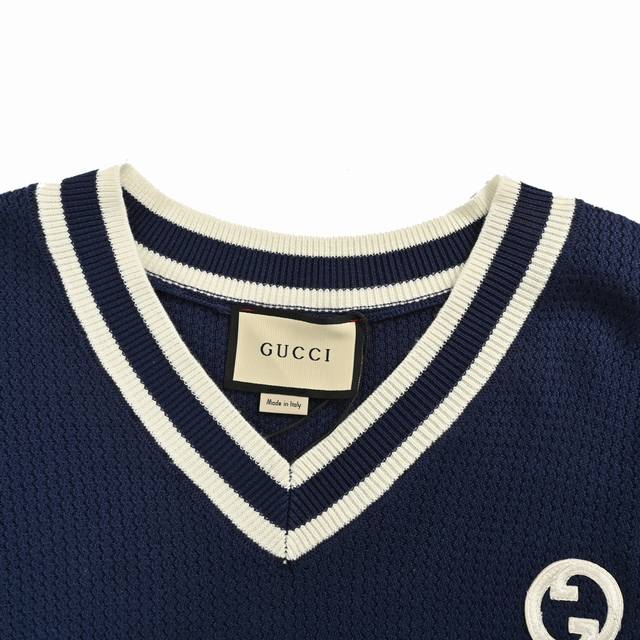 Gucci 24Fw Preppy Style Double G Embroidered Striped V-Neck Knit Sweater Ddd Classic knitwear is an essential part of shaping the brand's minimalist and refined aesthetic philosophy. Ddd The traditional silhouette is incorporated with iconic Gucci elements that interpret the brand's heritage, releasing a new charm. Ddd Striped webbing is one of the most recognizable elements. Ddd This top is crafted from a navy blue wool and cashmere blend fabric, featuring an interlocking double G logo embroidery design on the chest. Ddd Navy blue ribbed knit wool and cashmere blend fabric Ddd Interlocking double G logo embroidery Ddd Contrasting webbing Ddd Preppy style V-neck Ddd Size:SL DDD