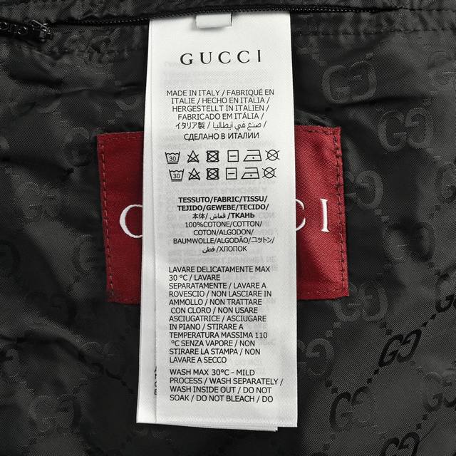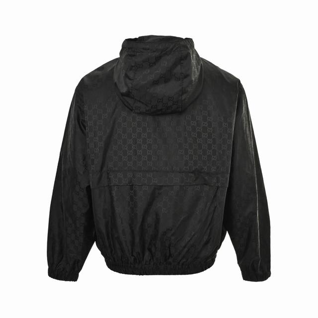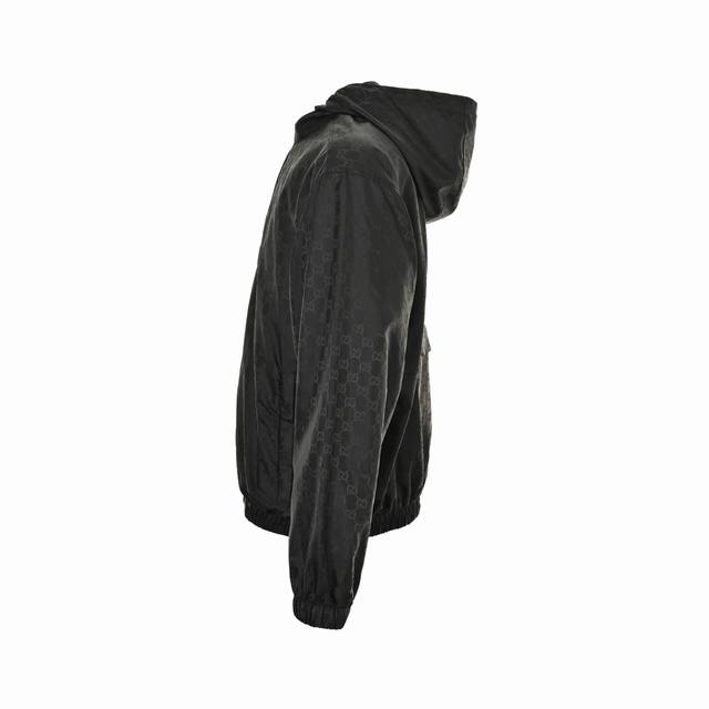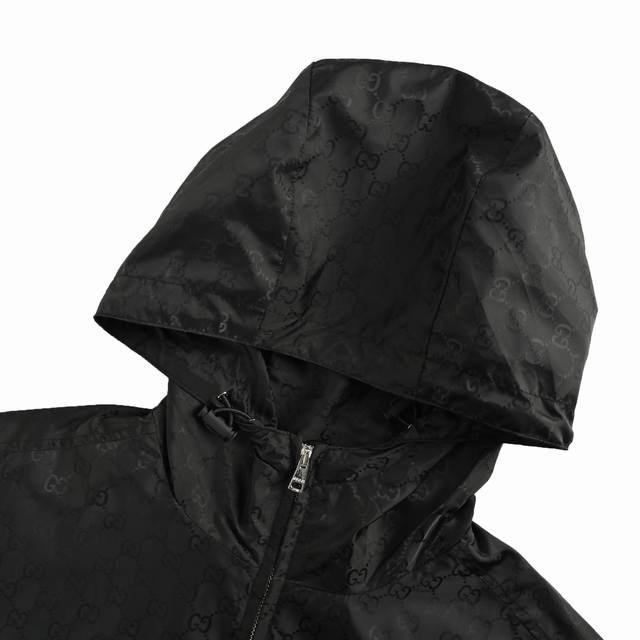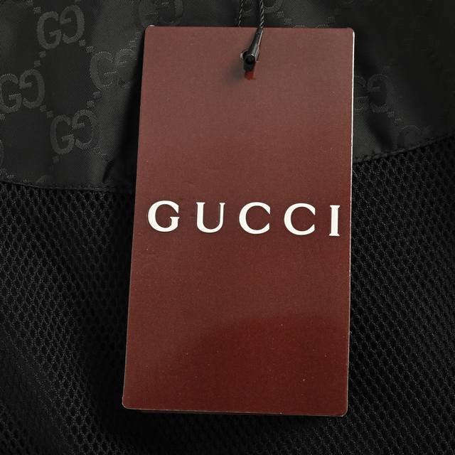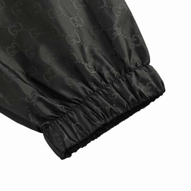 . Custom high-density mercerized nylon fabric with jacquard weaving technique, creating a full-width Gg jacquard pattern on the fabric surface for a more three-dimensional feel. Ergonomic three-dimensional tailoring. Slow and meticulous workmanship, complex and tedious process, slow delivery, high waste. Template machine opening, with preset templates guiding the position, shape, and size of the opening, ensuring precision and quality. Custom accessories. Loose fit