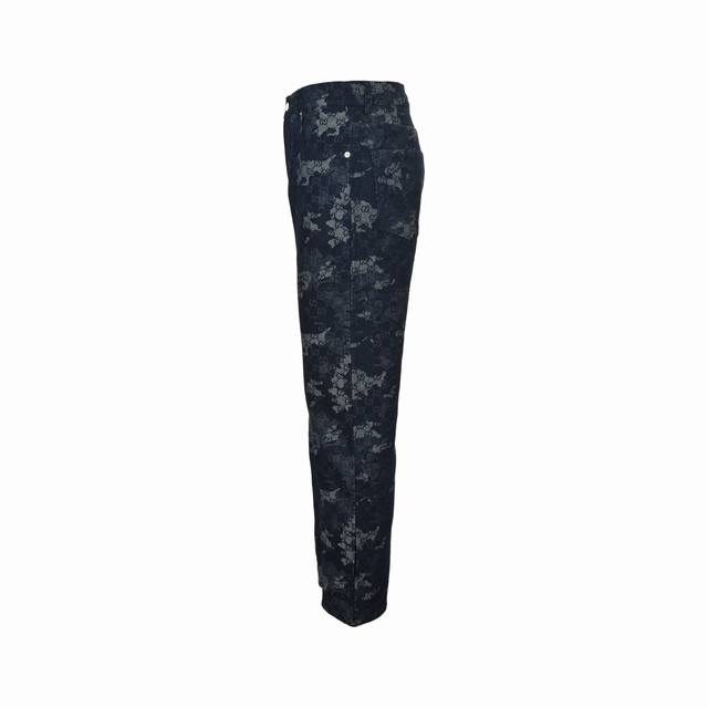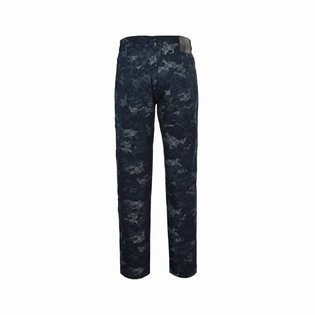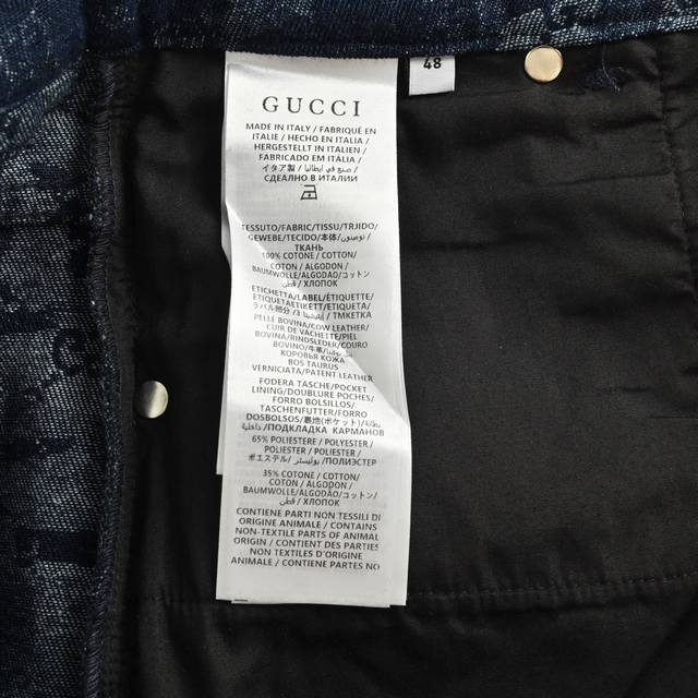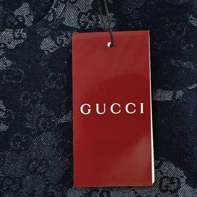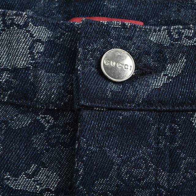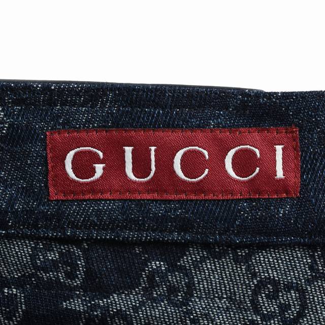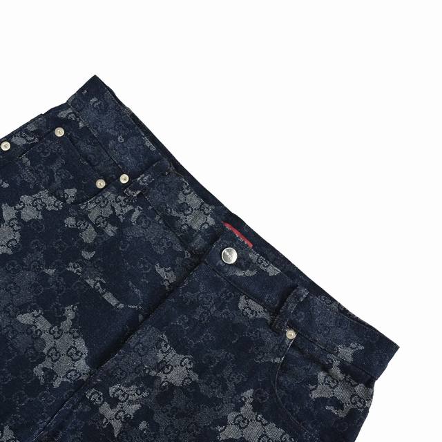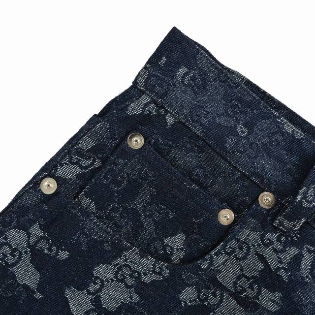 Gucci's new trousers are made of dark blue and ivory Gg marble-effect denim jacquard fabric, embellished with Naplak leather labels, giving it a unique charm.