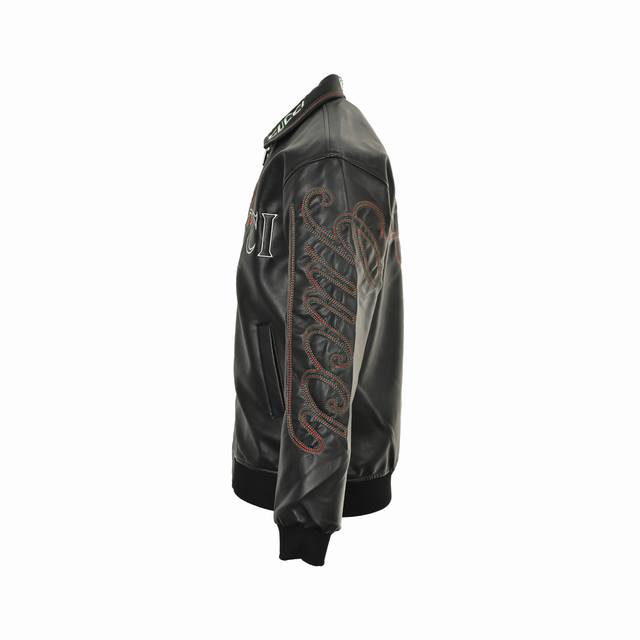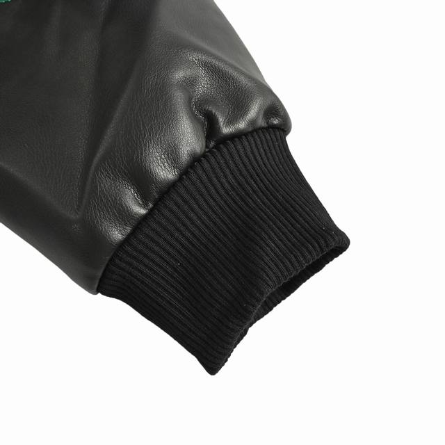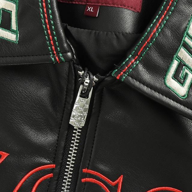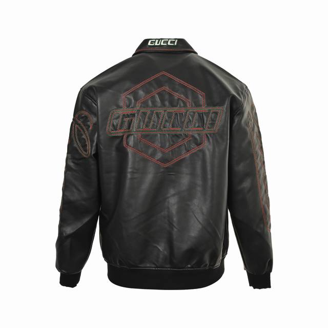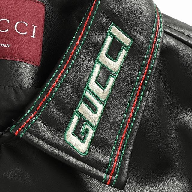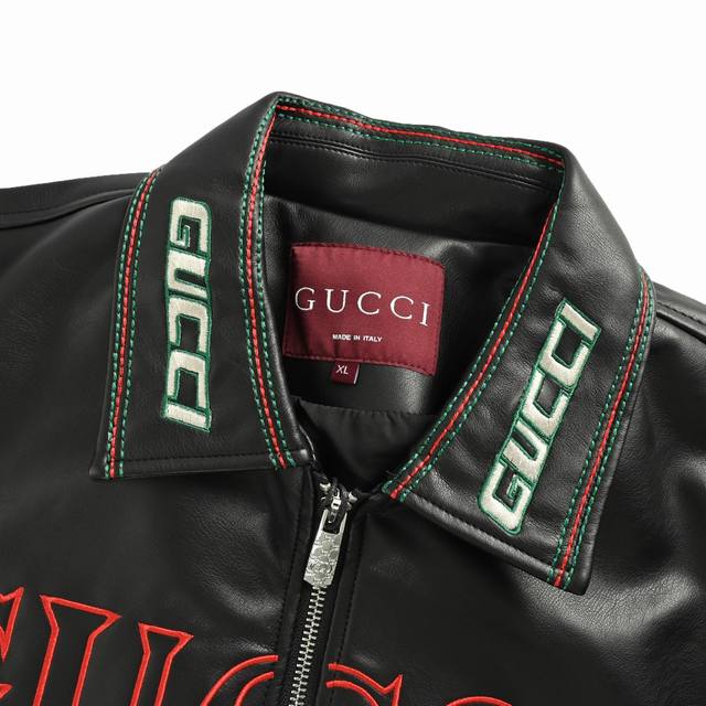 Gucci 25Fw leather jacket with embroidered Gucci logo on the chest. This season's new style. This motorcycle-inspired leather jacket features classic colorway yarns and large Gucci logo embroidered on the chest, back, sleeves, and collar. Size: M-Xxl