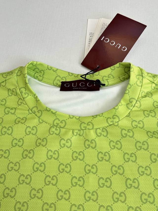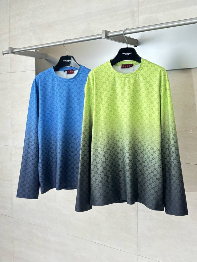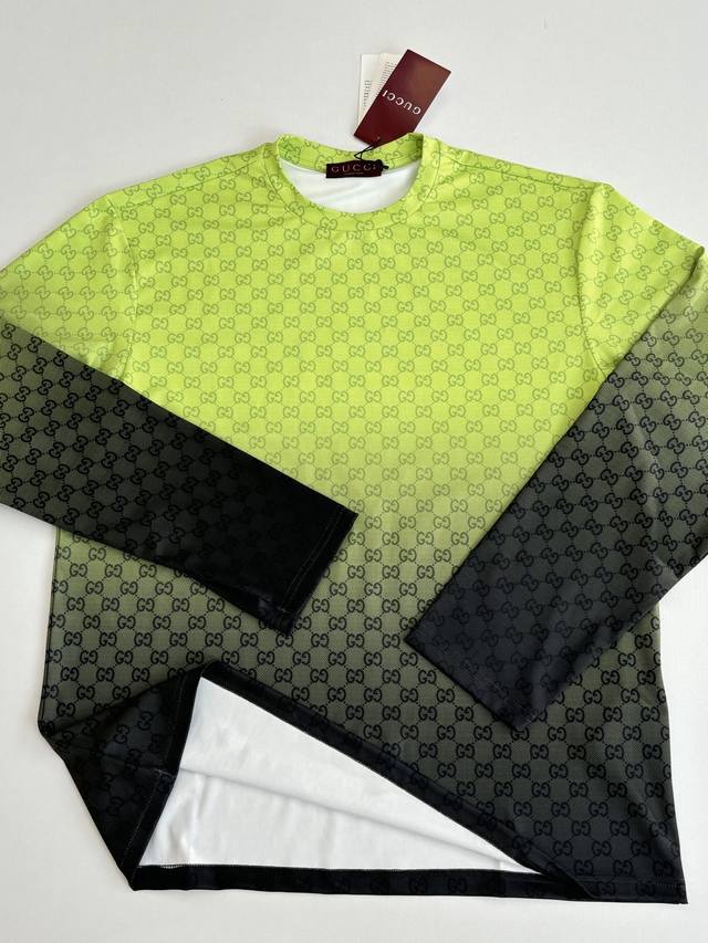 Gucci* 25Fw New All-Over Gradient Print Crew Neck Long Sleeve T-Shirt. The brand presents multiple gradient color schemes to highlight the fabric's texture and distinctive pattern. This T-shirt is crafted from lemon green to black gradient plain knit cotton, adorned with an all-over gradient print for a unique and stylish look. Size: SML XL