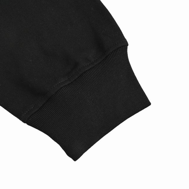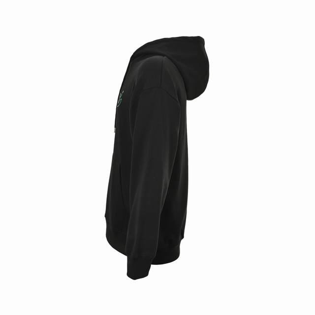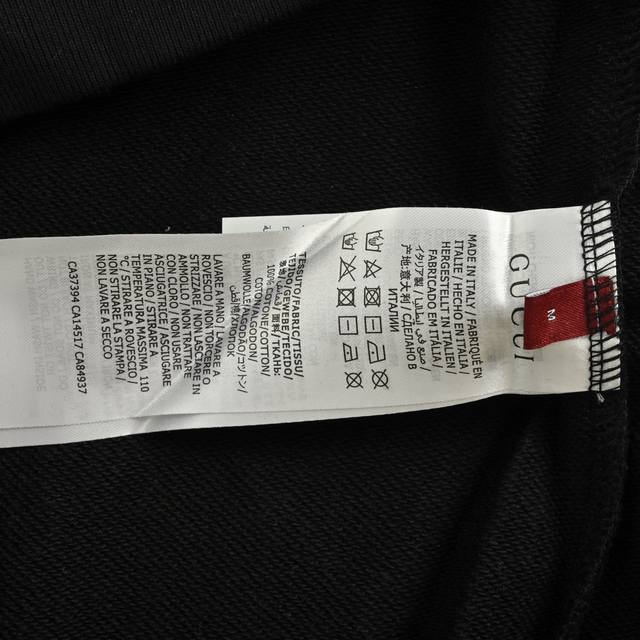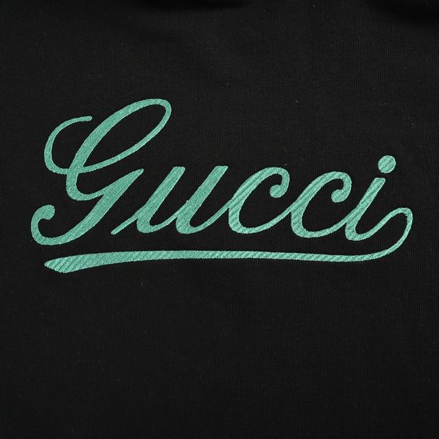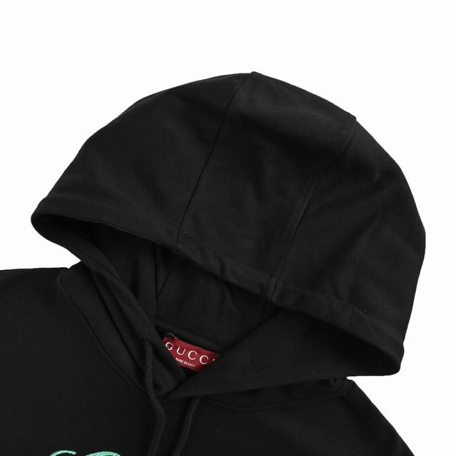 Gucci 25Fw signature logo embroidered hooded sweatshirt. Made of heavyweight felted cotton, perfectly aligned to the pattern, this 420g terry has a 32s thread count. Double-washed for a comfortable, skin-friendly feel, the pattern is soft and supple. The Gucci logo is embroidered in musical notes. The entire piece features a new tatami twill lace embroidery technique, with interwoven tatami stitches creating diagonal lines. The tatami woven surface is integrated with a shaped edge. The tatami woven surface offers excellent flatness, a soft feel, excellent elasticity, and a high gloss. The tatami woven surface is recessed compared to the shaped edge, enhancing the three-dimensional effect and visual impact.