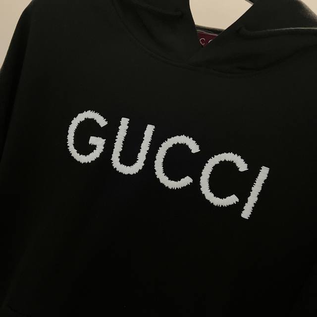 Gucci 420g pure cotton hooded sweatshirt. Features classic embroidered brand logo on the chest. Officially synchronized high-quality version. Stylish, versatile, and trendy. Made with original fabric. Includes hangtag, neck label, and wash label. Colors: Black, Apricot. Sizes: XS-L.
