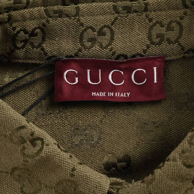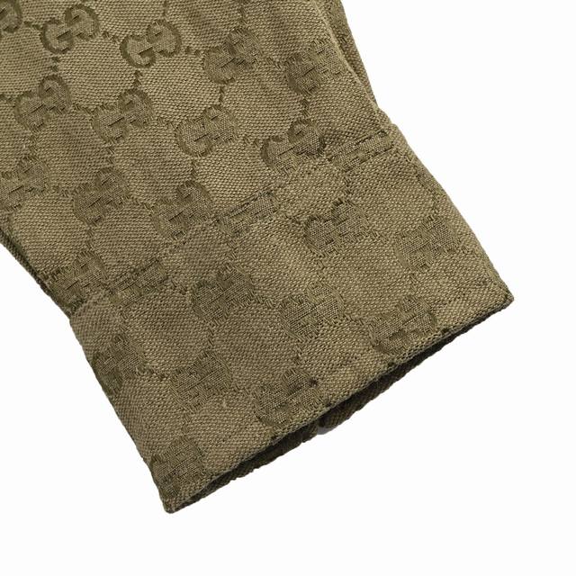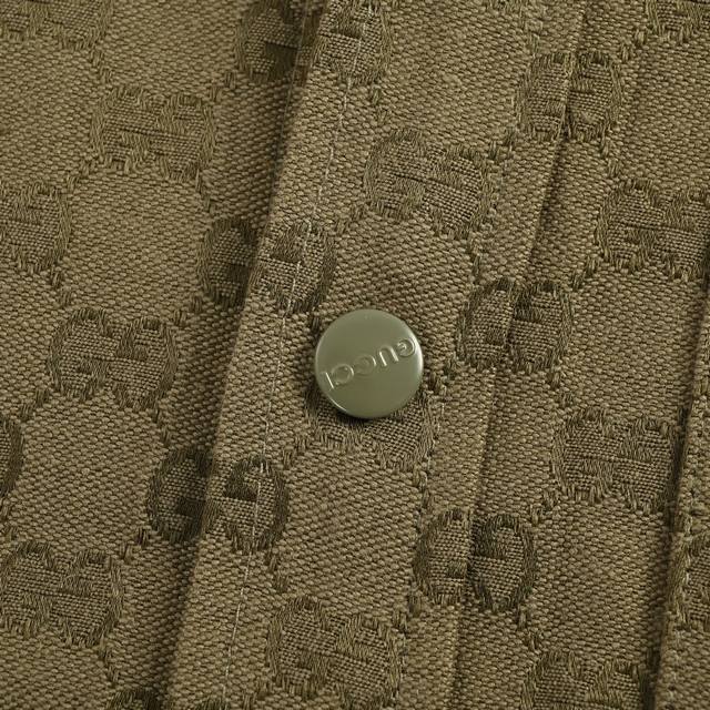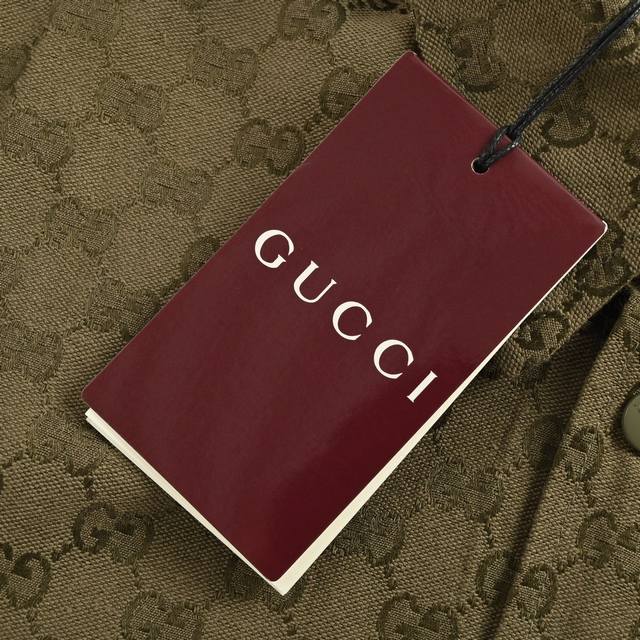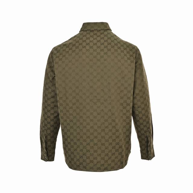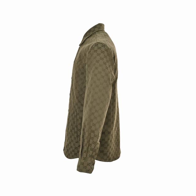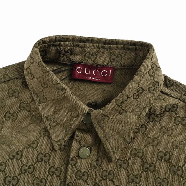 Gucci Button Matching Double G All-over Jacquard Stand Collar Shirt Jacket. Original version purchased for 11500. Made with original custom-woven Sirospun warp yarns, 100% cotton and nylon blend fabric, imported rapier loom color-spun jacquard process, jacquard monogram double G all-over print pattern. Laser cutting bed for pattern alignment, double G placket horizontally aligned, stitching process, ensuring neat and even cut pieces with minimal waste. Perfect alignment throughout, reflecting craftsmanship. Metal painted engraved buttons and snap closure, front patch pockets, curved hem, classic lapel design, straight shirt cut, three-dimensional and stylish fit, unisex, exclusive production. Size: 485052.