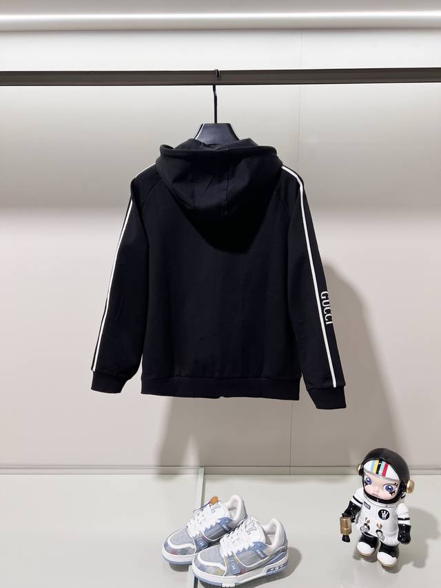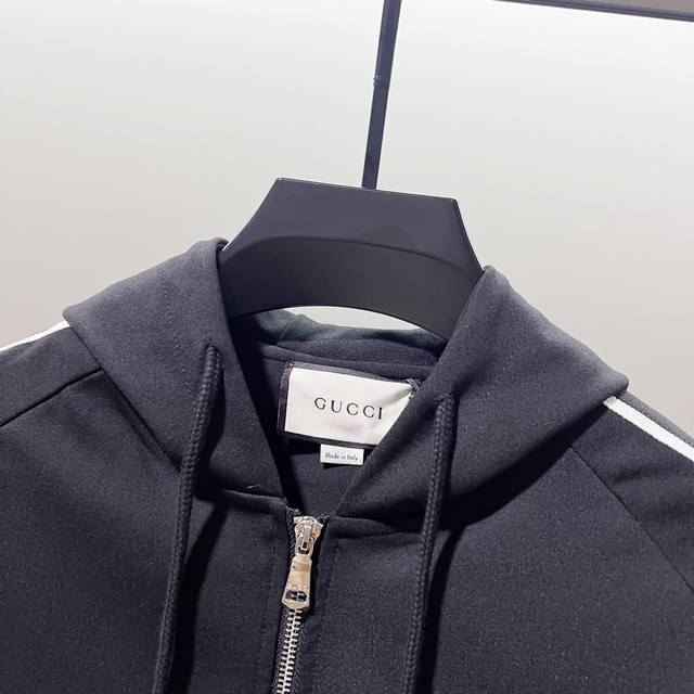 Gucci Custom Fabric Zippered Hooded Jacket Set. Features include a small embroidered logo on the chest and woven details on the sleeves. Officially synchronized high-quality version. Stylish, versatile, and trendy. Made with original fabric . Includes hangtags, neck labels, and washing instructions. Color: Black. Sizes: S-2XL.