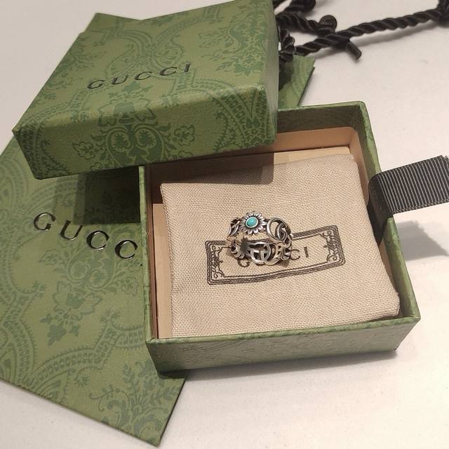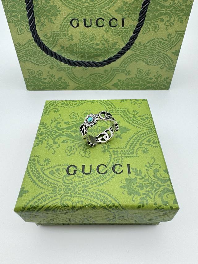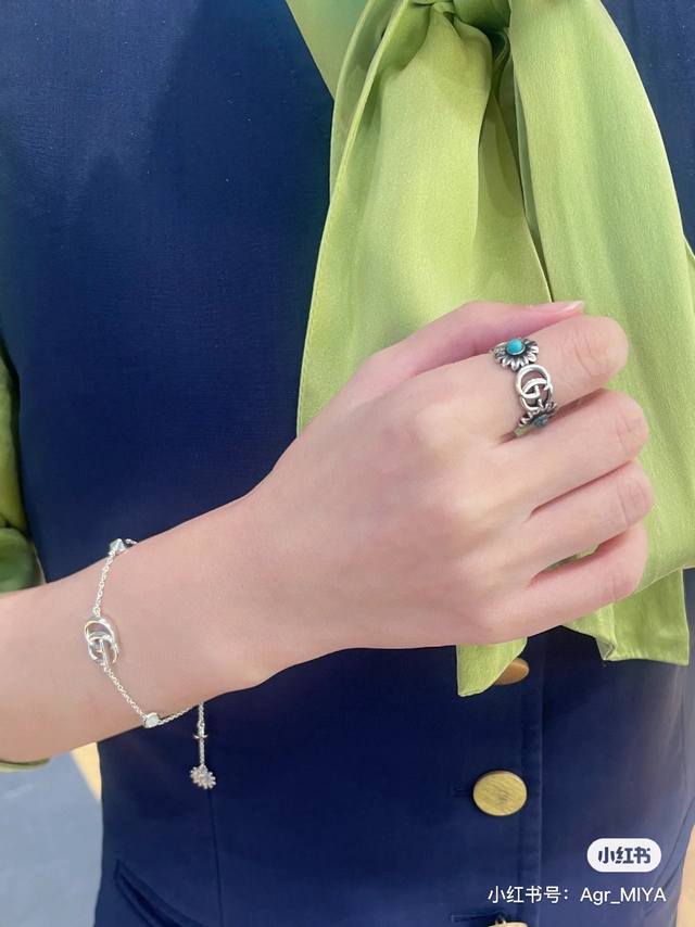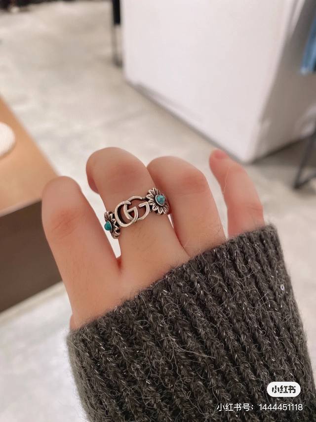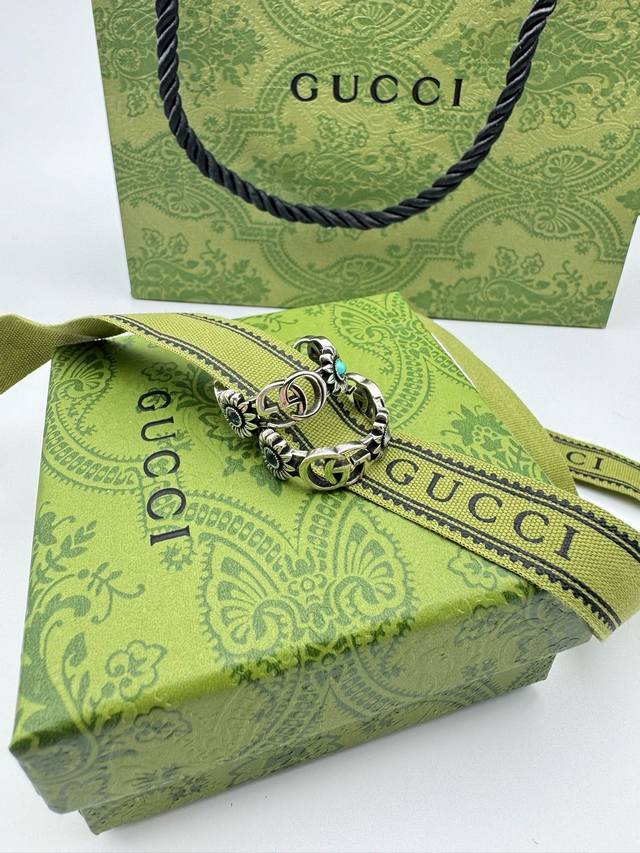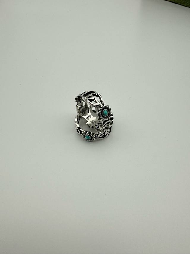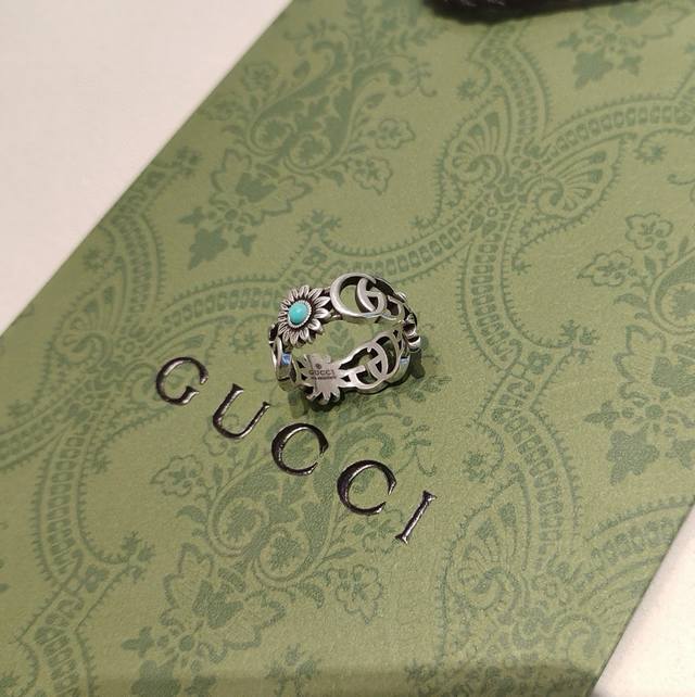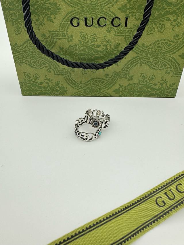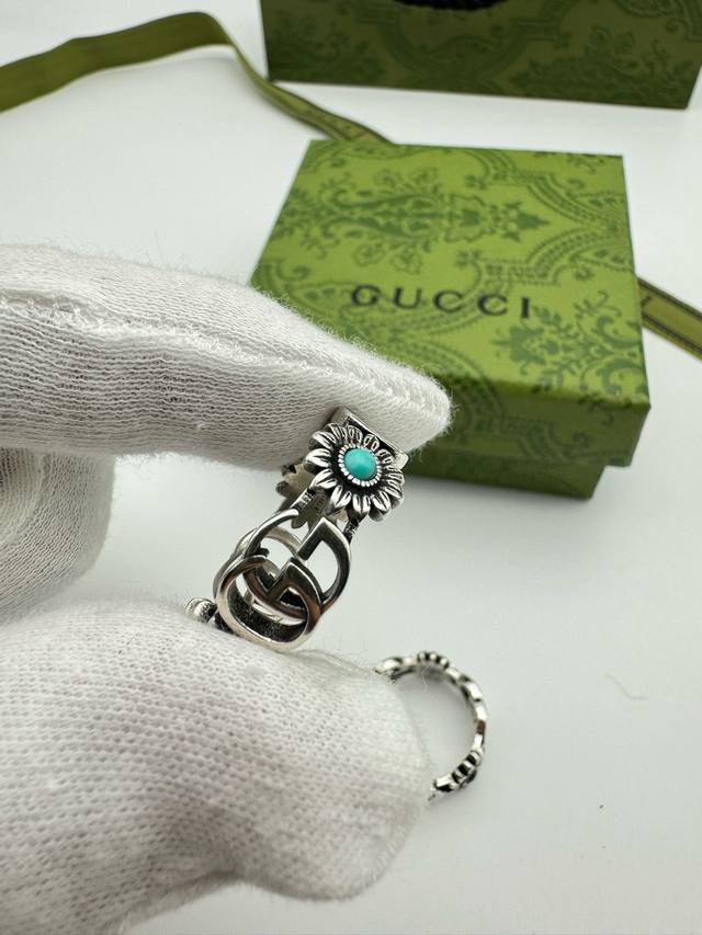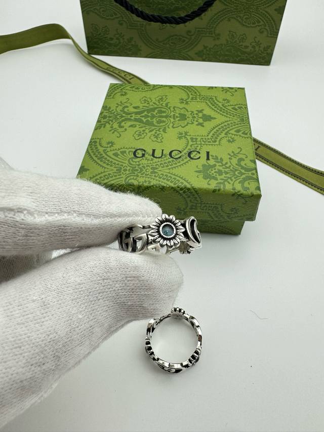 ) The brand's classic double G pattern appears on this silver ring, divided by a central colored gemstone flower. (