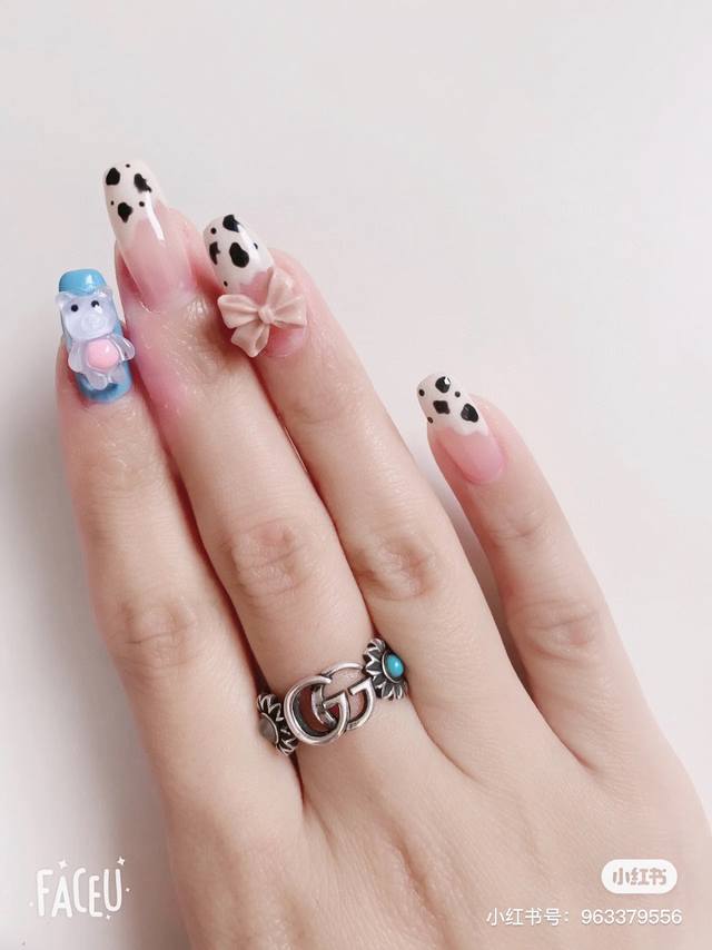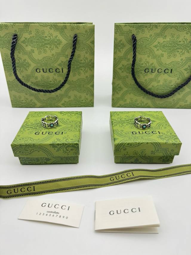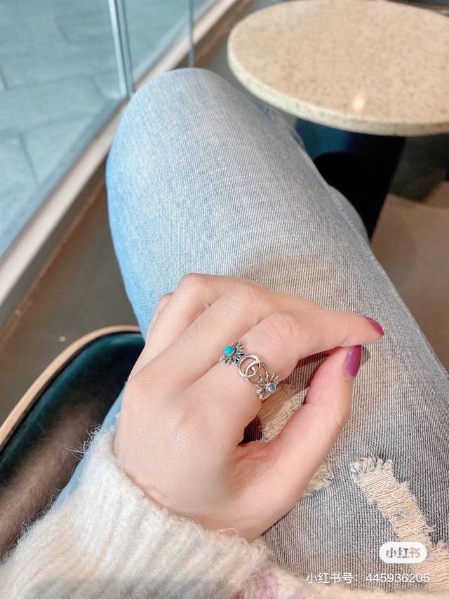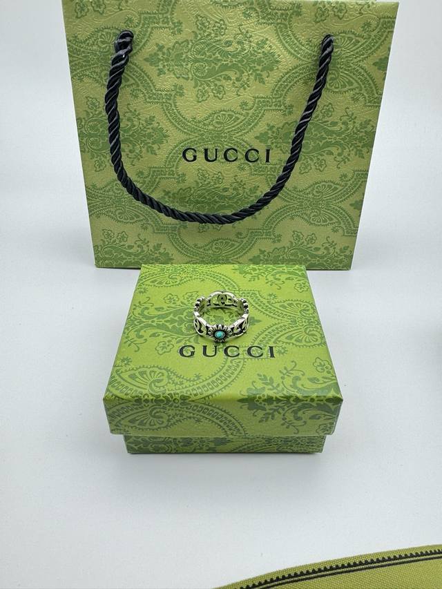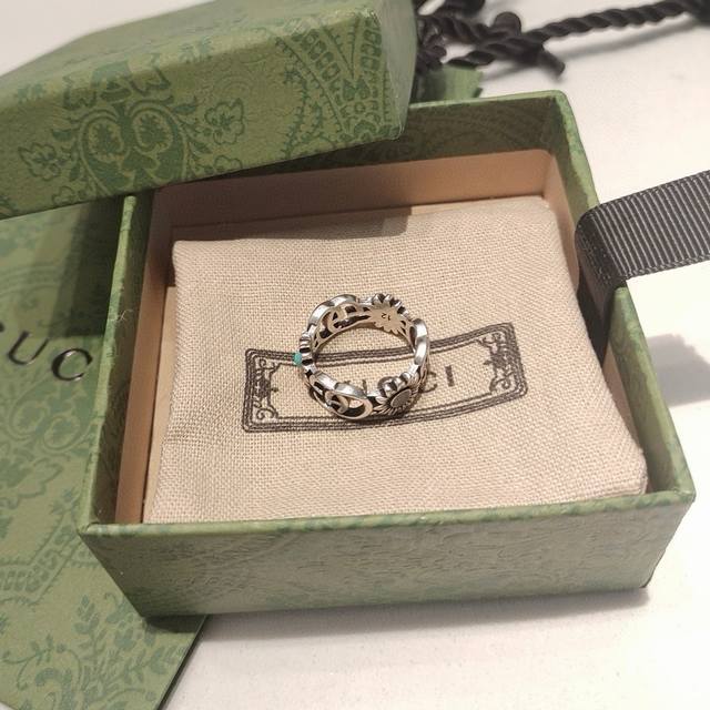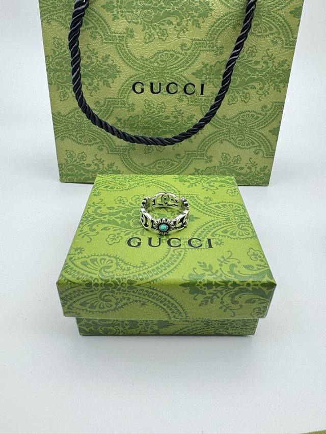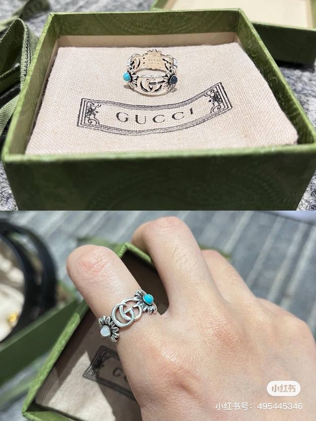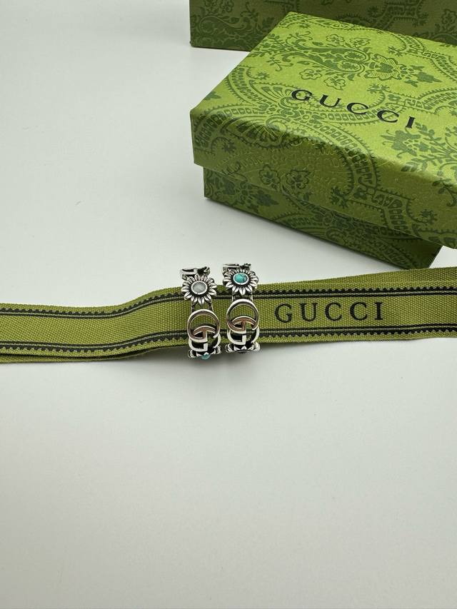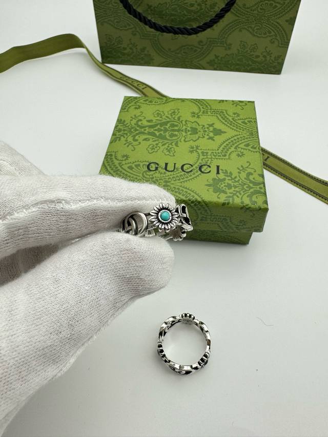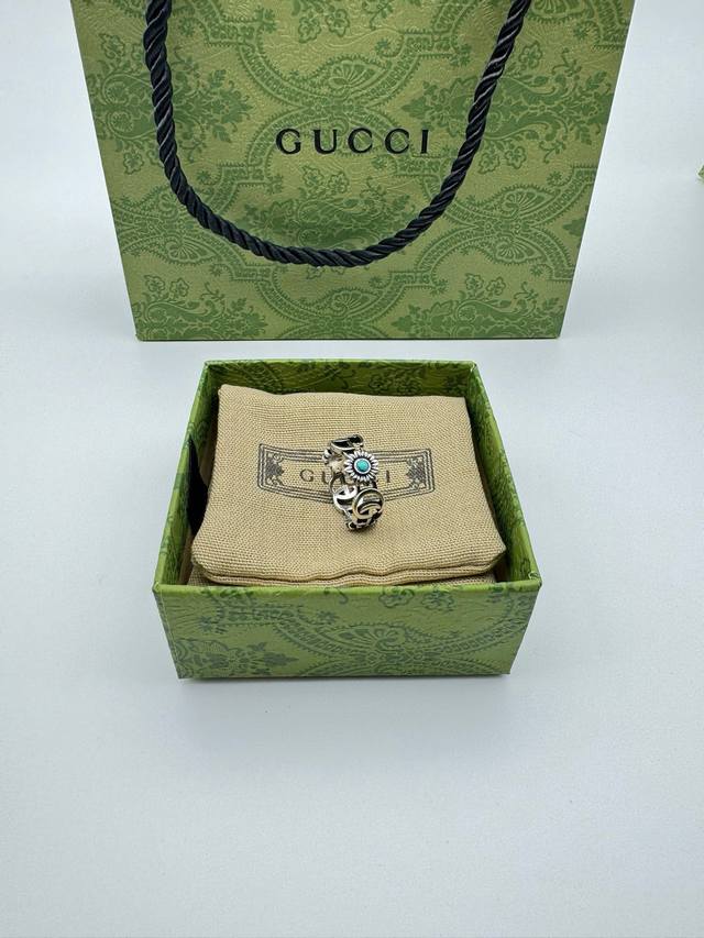 ) The brand's classic double G pattern appears on this silver ring, divided by a central colored gemstone flower. (