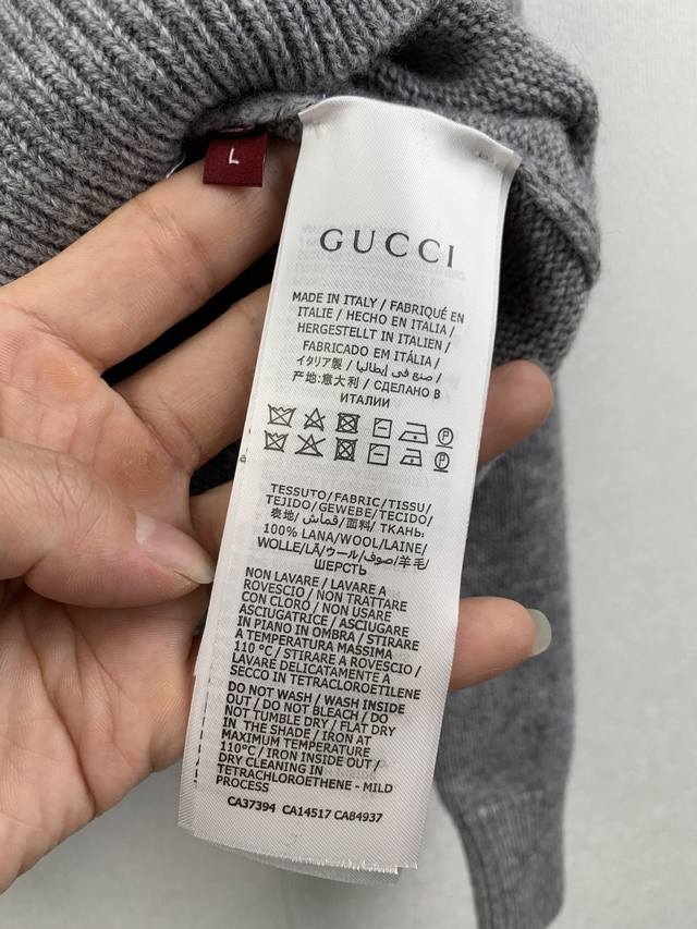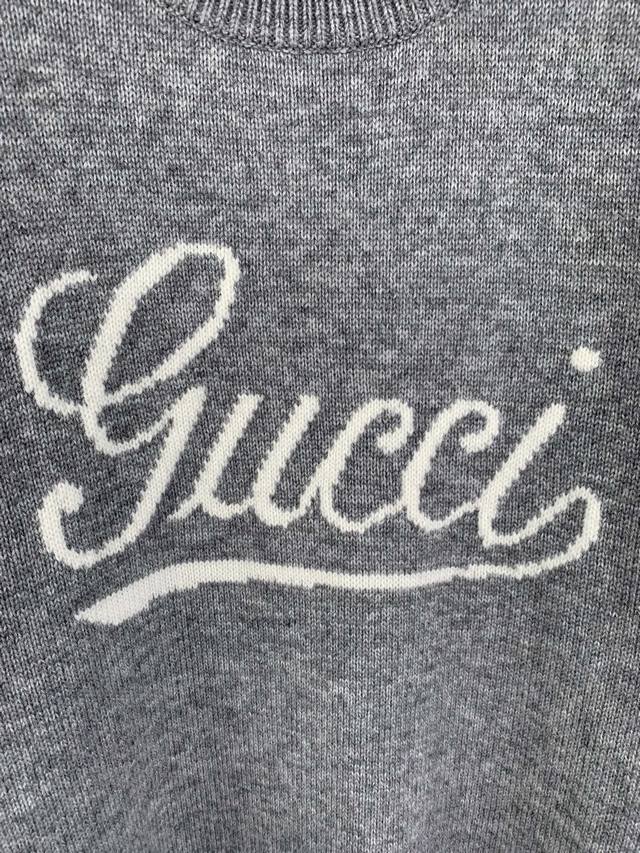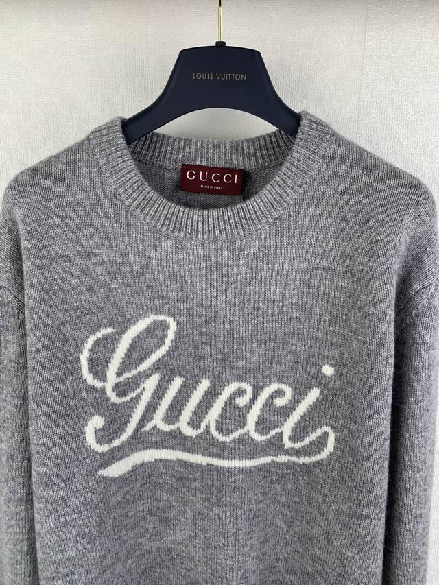 Gucci Embossed Knit Wool Sweater DDD The sweater features a green knit body with a handwritten "Gucci" inlay on the front and a solid color back. It has a simple, basic design and is made of 100% wool, offering a soft and warm feel. DDD The neckline has a red "Gucci Made In Italy" woven label, along with a red brand hangtag, consistent with authentic Gucci products. DDD Sizes: S-XL DDD