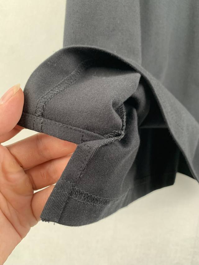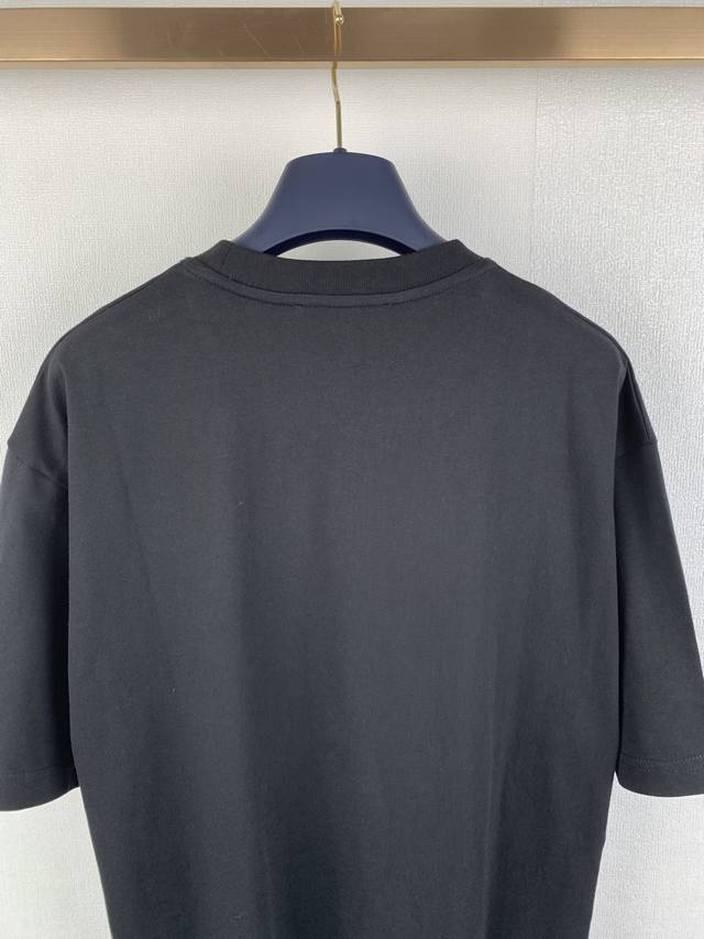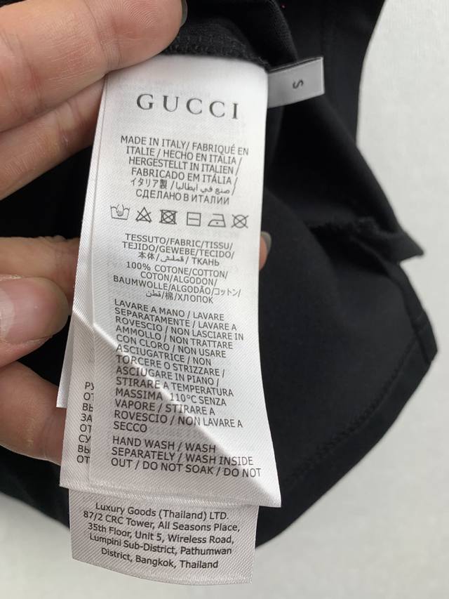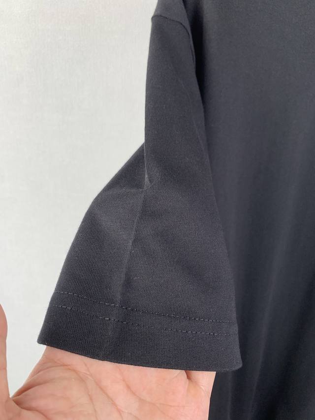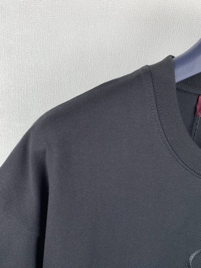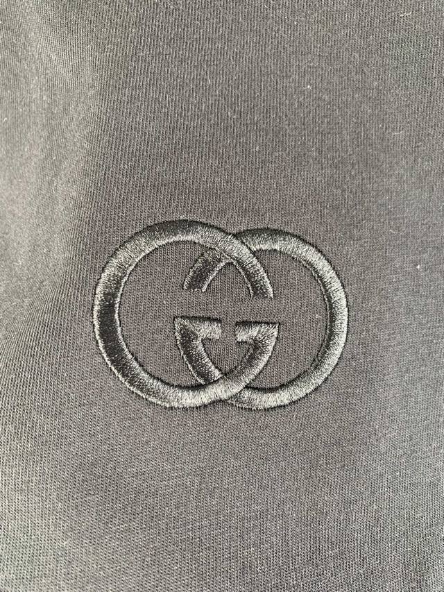 Gucci Embroidered GG Knit Cotton T-Shirt. Fabric: 15S Extra-Tight Cotton Fine Pile Knit Fabric 230g. Rib: 32S High-Density Rib 340g. Gucci brand elements are cleverly integrated into the silhouette, fabric, and craftsmanship, continuing the brand's heritage and interpreting contemporary aesthetics. This fine pile cotton knit T-shirt features interlocking double G embroidery, showcasing exquisite charm. Made from 15S Extra-Tight Cotton Fine Pile Knit Fabric, it perfectly balances crispness and softness against the skin. The tight spinning technology greatly reduces yarn fuzz, resulting in a delicate and smooth fabric surface. Combined with a slight brushing treatment, it gives it a cashmere-like richness. The neckline features 32S high-density 1x1 rib, ensuring excellent elasticity and deformation resistance. The DDD interlocking double G pattern utilizes a three-dimensional close-stitch embroidery technique. High-density, straight stitches are tightly arranged, allowing the embroidery threads to naturally accumulate and create a raised, embossed effect. The embroidered lines are clear and sharp, with a solid, full feel, forming a striking tactile contrast with the surrounding soft, plush fabric. This results in a vivid, three-dimensional effect reminiscent of hand-painted brushstrokes, along with durable quality.