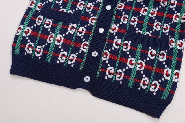 Brand Logo Design: The entire cardigan features the brand's iconic double G logo, combined with red, green, and white colors to form a checkered layout, while being embellished with metal rivet elements. The collision of retro and avant-garde styles embodies Gucci's "classic symbols + rebellious design" language, strengthening brand recognition while adding visual depth.