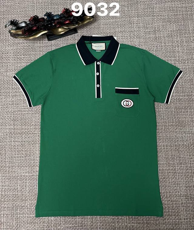 Gucci men's open-chest lapel style, 9032, pure cotton fabric, embroidered pockets, available in black, green, and apricot. Sizes M, L, XL, XL, XLXL.