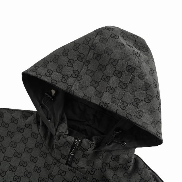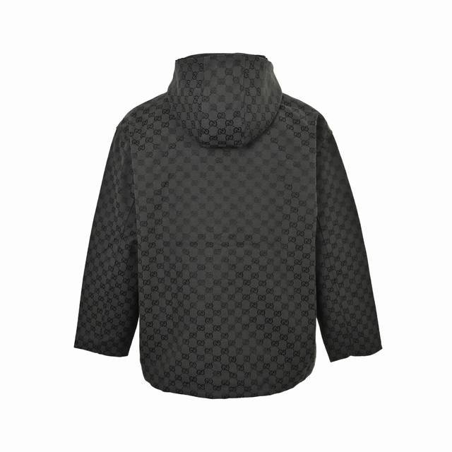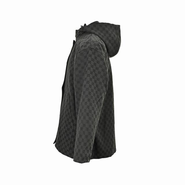 Gucci monogram trench coat, reversible. Made with jacquard Gg fabric, dyed in beige and ebony, the monogram design is neatly arranged for a perfect reproduction. The workwear jacket cut and simple silhouette are comfortable and practical, exuding a cool and modern urban style. Features include a double-ended nylon zipper closure, elasticated cuffs, an adjustable hem, a drawstring hood with cowhide trim, four zippered pockets on the front, and lining on the interior and sleeves, with an additional pocket inside the lining. Size: Xs-L