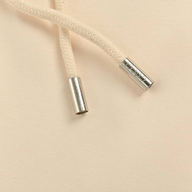 drawstring is customizable and engraved with the logo. The overall look is simple yet detailed, with a loose, casual fit.