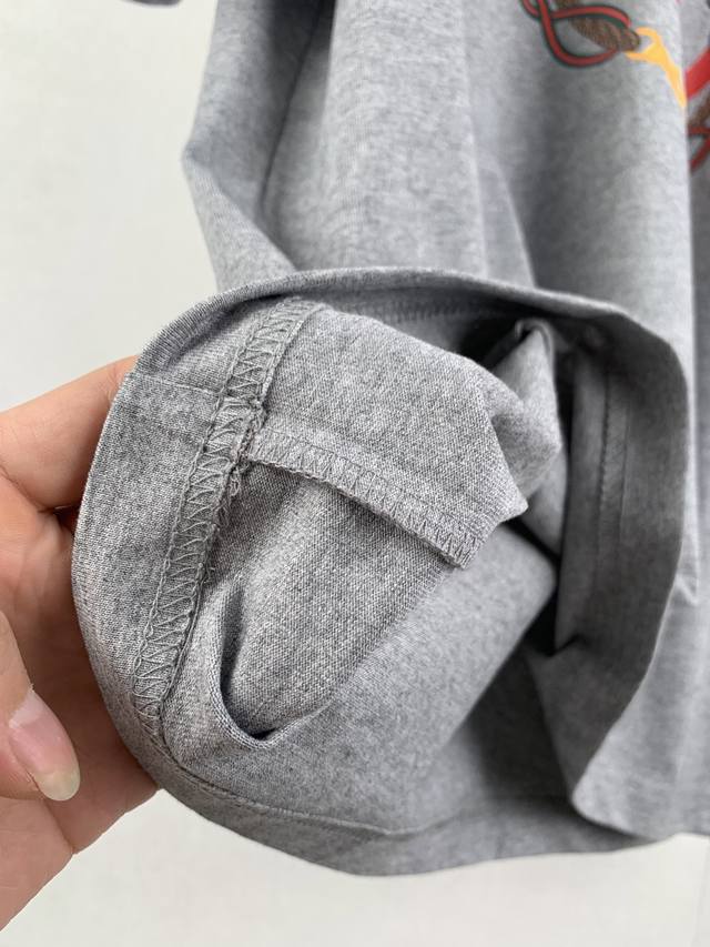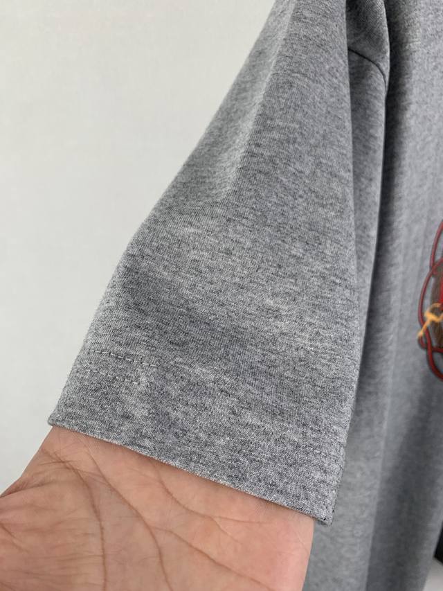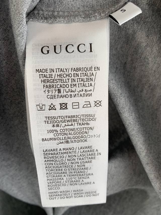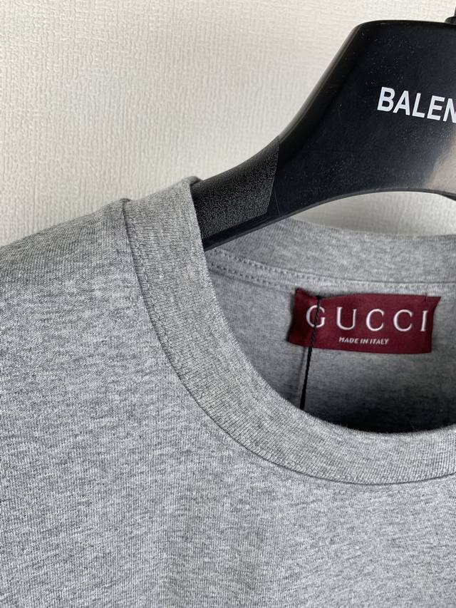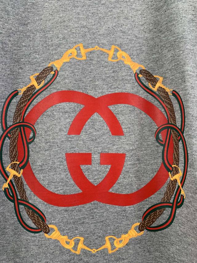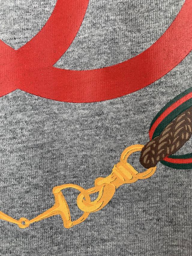 Gucci Reins Print Knit Cotton T-Shirt Fabric: 15S Extra-Durable Tight-knit Cotton 230g Rib: 32S High-Density Rib 340g The 2026 Early Spring Ready-to-Wear Collection pays homage to Gucci's fashionable style, playfully blending the brand's heritage elements with Florentine heritage through mixed color combinations, presenting diverse pieces ranging from minimalist style to maximalist designs. This T-shirt is crafted from premium knit cotton, cleverly incorporating an interlocking double-G print with reins embroidery. Made from 15S Extra-Durable Tight-knit Cotton, its 230g/m? weight precisely balances softness and a moderate firmness. The tight spinning technique greatly reduces yarn fuzz, resulting in a delicate and smooth texture, complemented by a light brushed finish for a cashmere-like richness. The neckline features 32S high-density 1x1 rib, with an ultra-high weight of 340g/m? providing military-grade elasticity to ensure the collar maintains its crispness over time. The DDD interlocking double-G rein pattern utilizes environmentally friendly elastic plastisol printing technology. Through the combination of water-based environmentally friendly plastisol and a high-molecular cross-linking agent, an elastic bond is achieved between the printed layer and the fabric substrate. This process gives the pattern a semi-matte texture and up to 200% stretch resilience, ensuring the print does not crack with fabric movement. It has a soft touch and no hardening sensation from the plastisol, perfectly maintaining the fabric's original breathability and comfort.