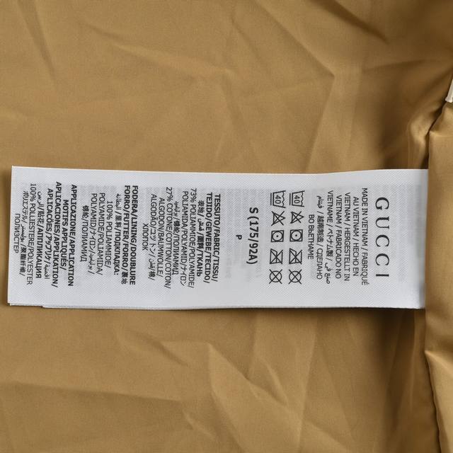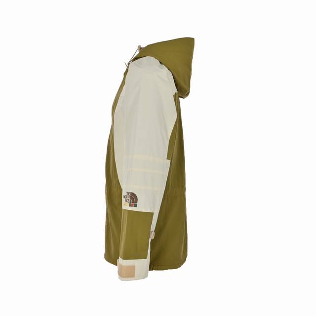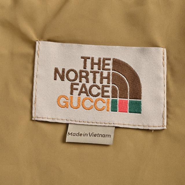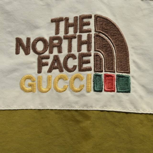 Gucci & The North Face Collaboration Windbreaker Jacket. Features a waterproof coating on the reverse side of the fabric, printed with imported embroidery machines for a full and perfect reproduction of the original fabric. Custom YKK zippers ensure the most accurate fit. The jacket includes a size 5 resin zipper on the placket, four size 3 resin zippers on the outer pockets and sleeves, three reverse-zip metal zippers on the lining, and hidden zippers on the side pockets and sleeves. The professional-grade waterproof coated fabric, with full-body taped waterproof coating, provides excellent waterproof performance. A thin fleece lining offers excellent warmth, wind protection, and breathability. The polyamide fiber composition is digitally printed using infrared screen printing and disperse dye printing. Over 20 patterns were created for each size and part of the print, requiring workers to cut according to the pattern