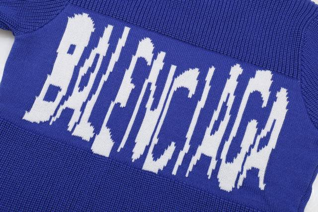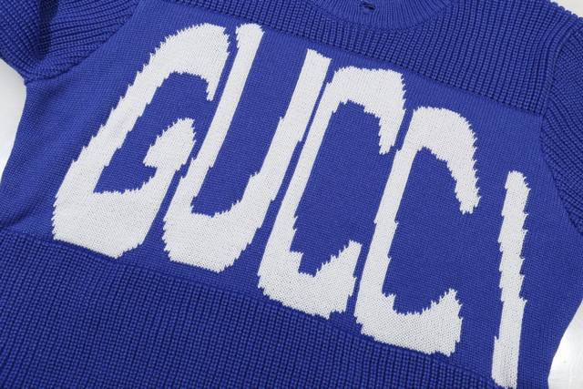 Gucci x Balenciaga Co-branded Crew Neck Knit Sweater with Distressed Design. Brand Logo Design: The front prominently displays the brand name "Gucci" in a striking black and white color scheme. The artistic font style is visually impactful, a typical design technique used by the brand to strengthen its brand recognition. Fit and Material: The loose-fitting crew neck knit sweater is comfortable and adaptable to various body types. The distressed knit material blends street style with high-end luxury, reflecting the brand's recent "retro-chic" design strategy and meeting the needs of young people for personalized style. Color Scheme: Classic black as the base color, with a white brand logo creating a strong contrast. Simple yet sophisticated, it's versatile and easily integrates into various styles. Sizes: S, M, L, XL, XL