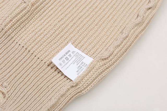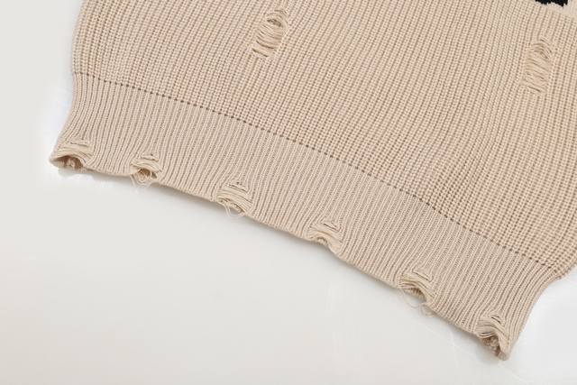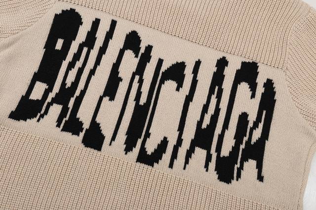 Gucci x Balenciaga Co-branded Crew Neck Knit Sweater with Distressed Design. Brand Logo Design: The front prominently displays the brand name "Gucci" in a striking black and white color scheme. The artistic font style is visually impactful, a typical design technique used by the brand to strengthen its brand recognition. Fit and Material: The loose-fitting crew neck knit sweater is comfortable and adaptable to various body types. The distressed details on the knit material blend street style with high-end luxury, reflecting the brand's recent "retro-chic" design strategy and meeting the needs of young people for personalized style. Color Scheme: Classic black as the base color, with a white brand logo creating a strong contrast. Simple yet sophisticated, it's versatile and easily integrates into various styles. Sizes: S, M, L, XL, XL