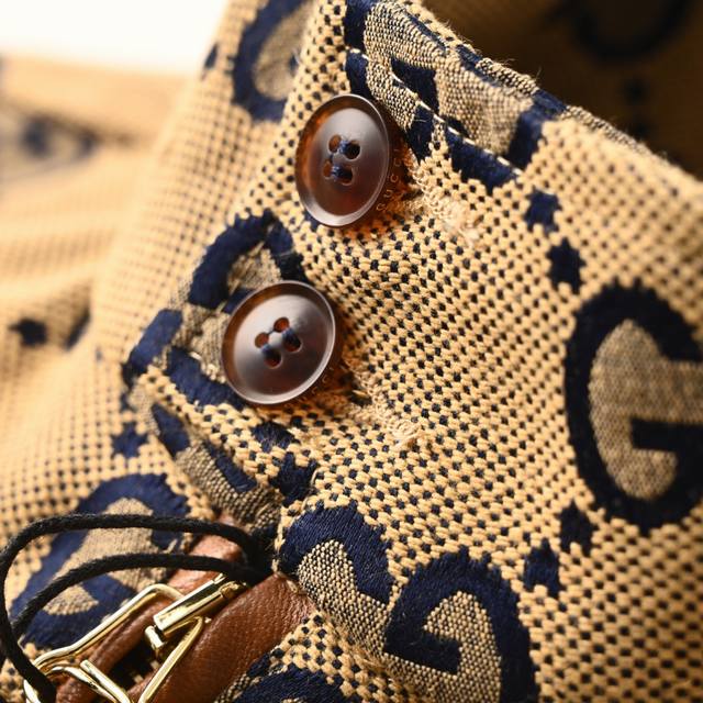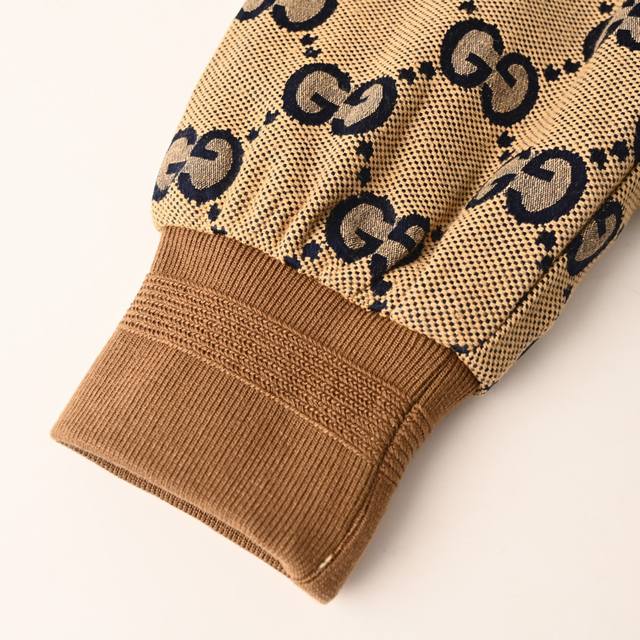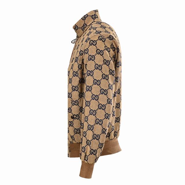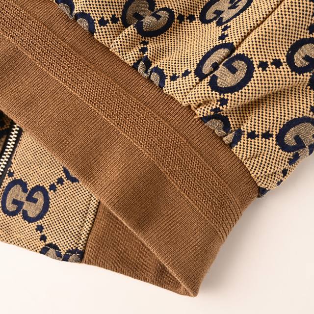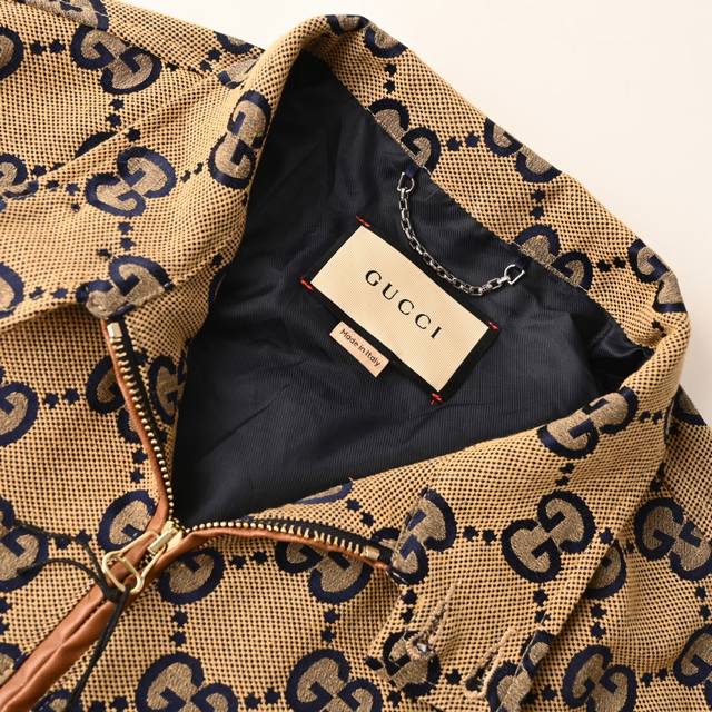 . Made from custom jacquard fabric with a leather zipper, the outer fabric is a spun, original-color navy yarn with the Double G logo, and the lining is a navy rayon twill. This jacket is incredibly time-consuming and labor-intensive, featuring imported, machine-cut buttons with a phoenix-eye technique. The buttonholes are a fully matched vintage jacquard pattern, the placket is made from genuine top-grain cowhide, and the hardware is made from genuine 95% high-quality white copper. The buttons are individually molded and engraved, and the fabric is double-layered, meticulously crafted. One-to-one, original, with all three labels.